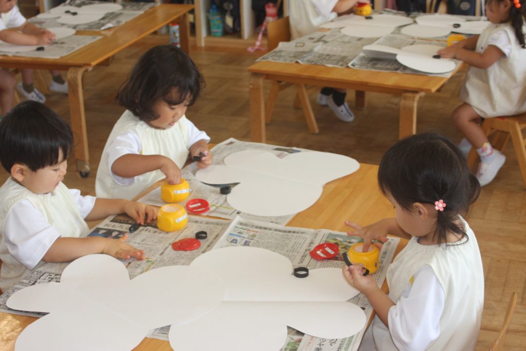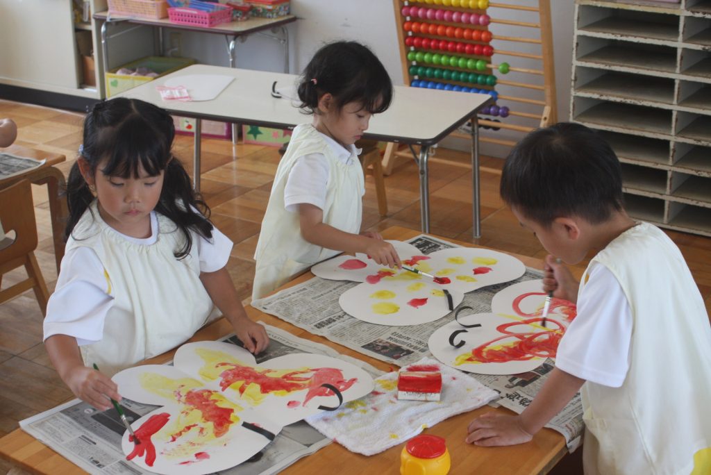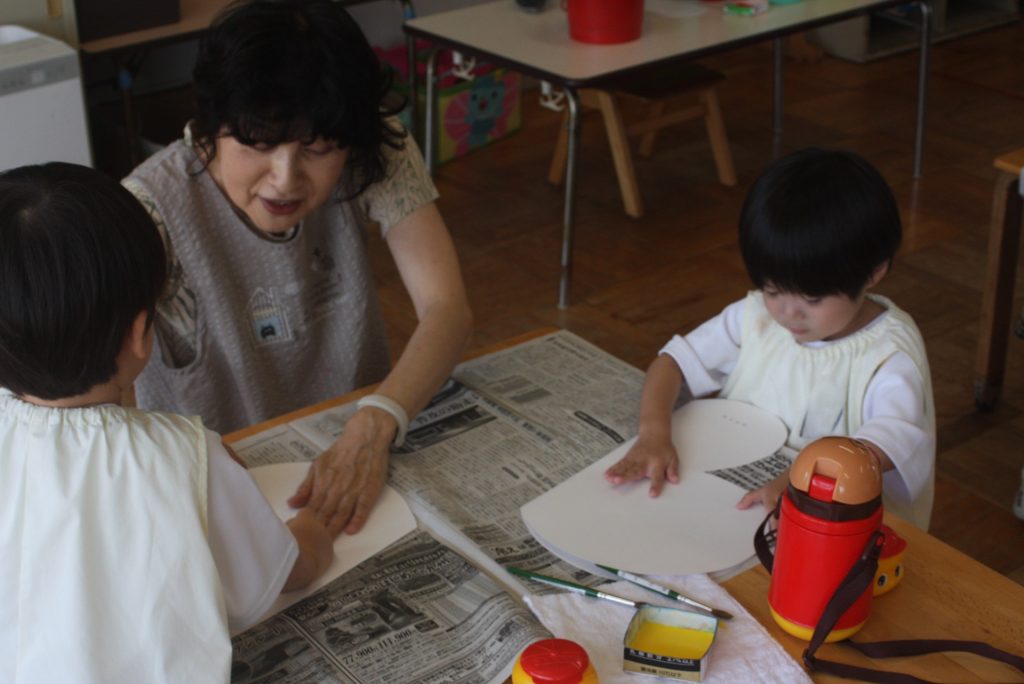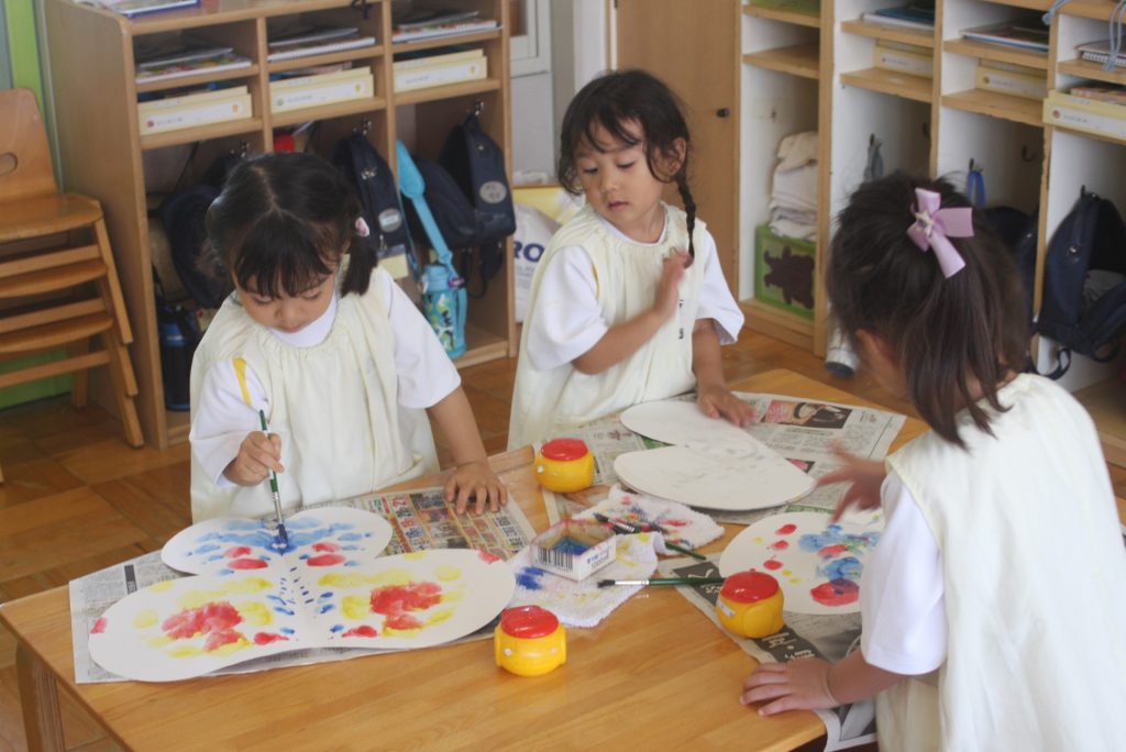 おしゃれなちょうちょ(デカルコマニー) 2024年07月18日 赤学年(年少児) 本日の絵画教室は、デカルコマニーという紙と紙の間に絵の具をたらし、二つを重ねることで予想できない模様が生まれる手法を使って、「おしゃれなちょうちょ」を制作しました。子どもたちの「やりたい!!」がいっぱいの時間となりました。