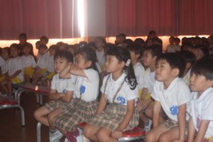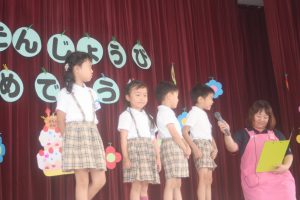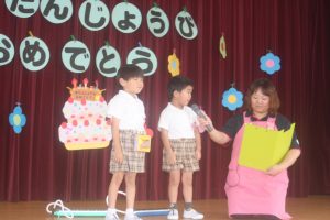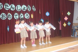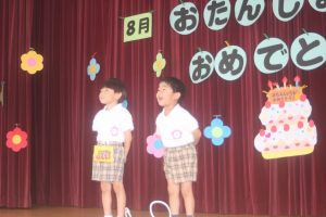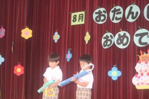 お誕生日会 8月 2025年08月29日 園の様子 今日は、8月生まれのお友だちのお誕生日会でした。人数の少ない学年もありましたが、堂々と発表ができました。また、先生からの「ブラックライトシアター」は、素敵でしたね。