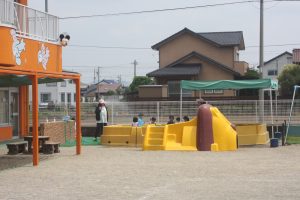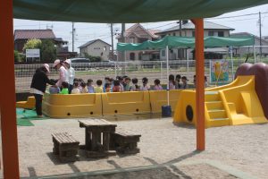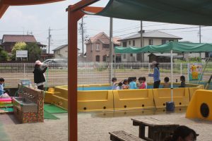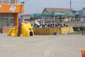 はじめてのプール 赤学年 2025年07月04日 赤学年(年少児) 本日、赤学年(年少)がはじめてプール遊びを行いました。これまで、天気や行事でのびのびになっていたため、子どもたちは大喜びです。(遠景の写真を掲載しました)