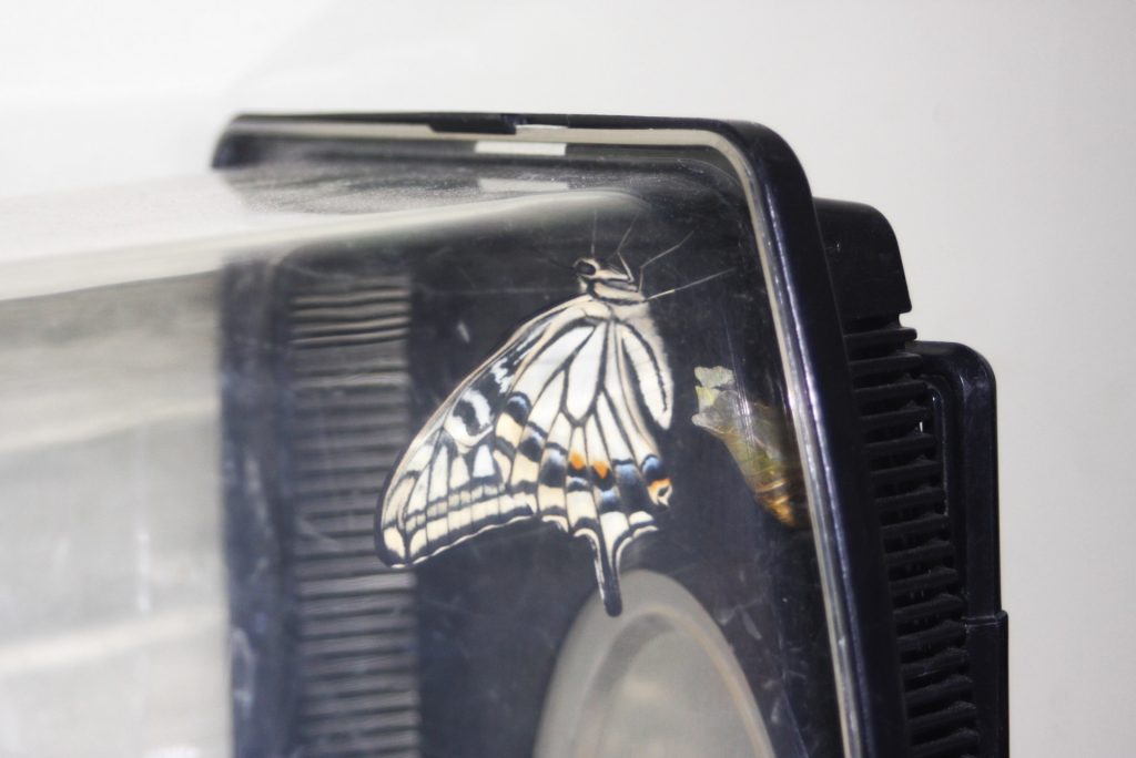 幼虫だった小さな命がさなぎになり、アゲハチョウに羽化しました。今日、朝礼でお話しし、プラスチックケースから外の世界へと飛んでいきました。
