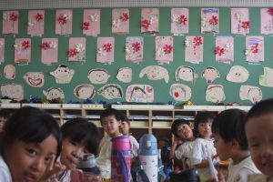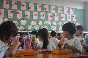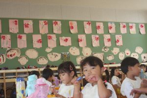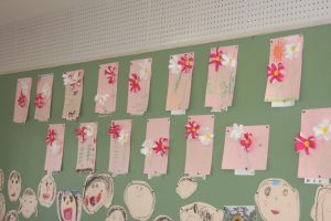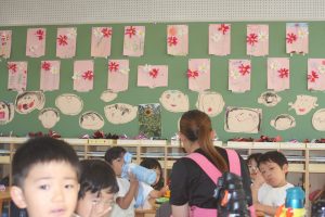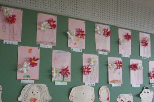 桃学年では、コスモスの花を制作しました。教室の壁面に飾りました。コスモスは、漢字で「秋桜」と書きます。秋を感じますね。