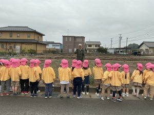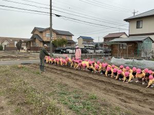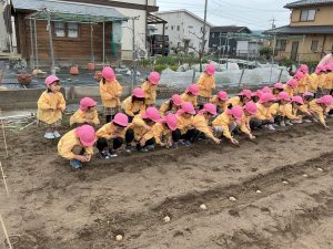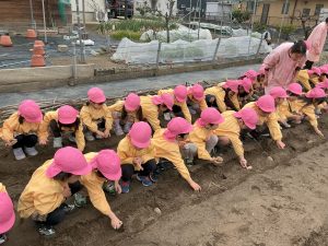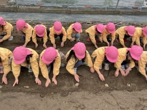 2月27日(金)に桃学年(年中)では、ジャガイモ種芋を植え付けました。前園長の紀藤先生にお手伝いいただきました。ありがとうございました。立派なジャガイモが収穫できるといいですね。