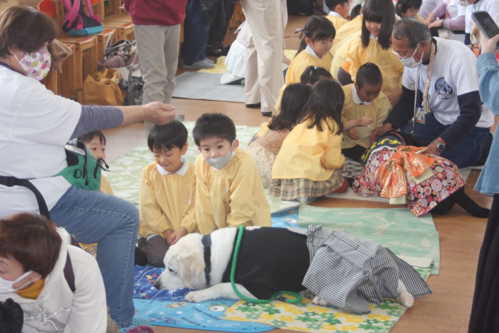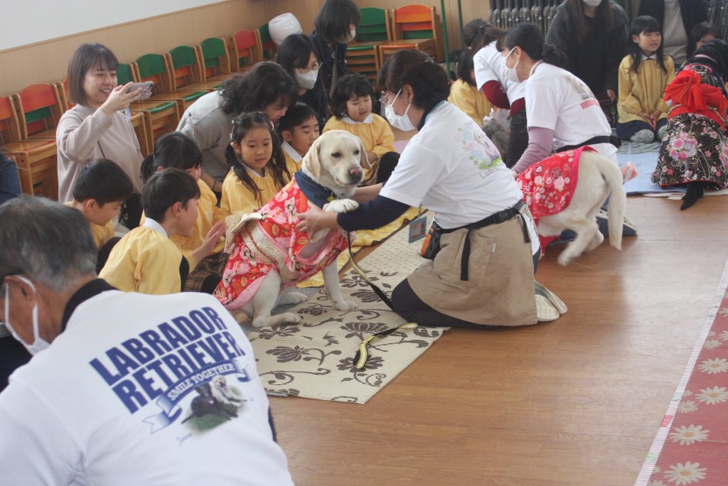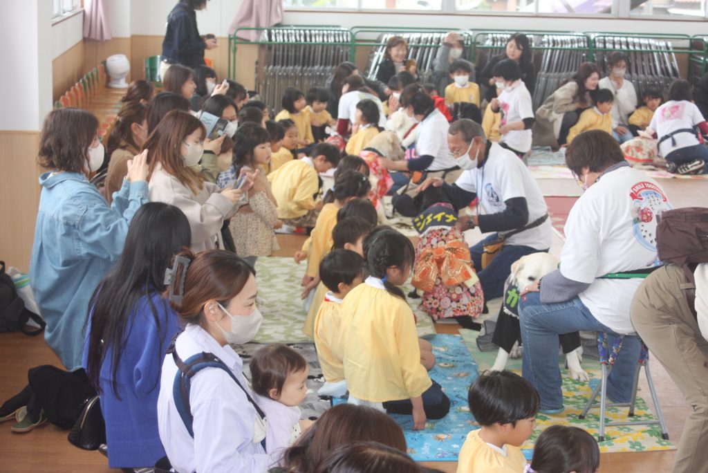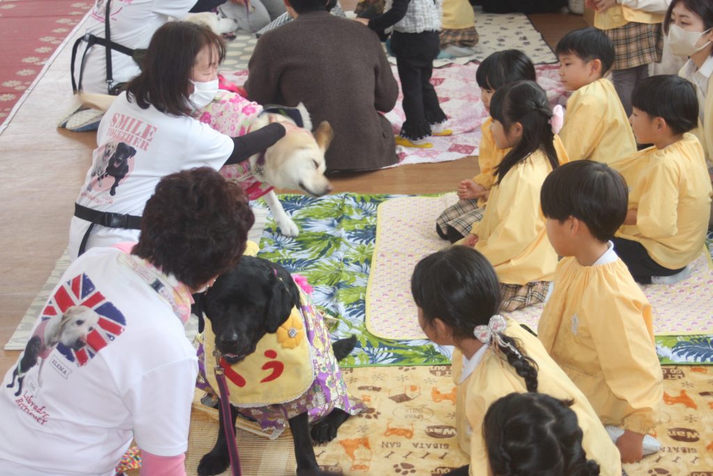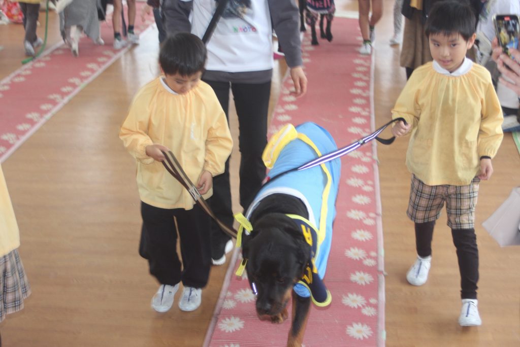 セラピードッグとふれあおう 青学年 2026年02月27日 青学年(年長児) 今日は、マロン・セラピードッグ協会から17頭のセラピードッグと17名のセラピストの皆さんにご来園いただき、「セラピードッグとふれあおう」の体験活動を行いました。最初は、大きな犬に驚いていた子どもたちですが、次第に慣れ、やさしく背中をなでる姿がまさに癒しの場面でした。多くの保護者様にも、ご参観いただき、子どもたちは卒園前に楽しいひと時を過ごしました。
