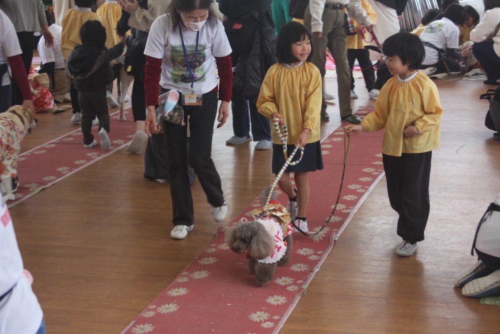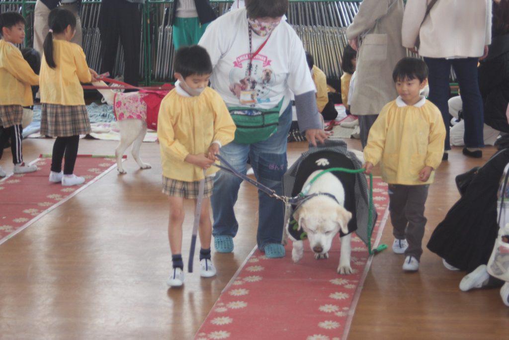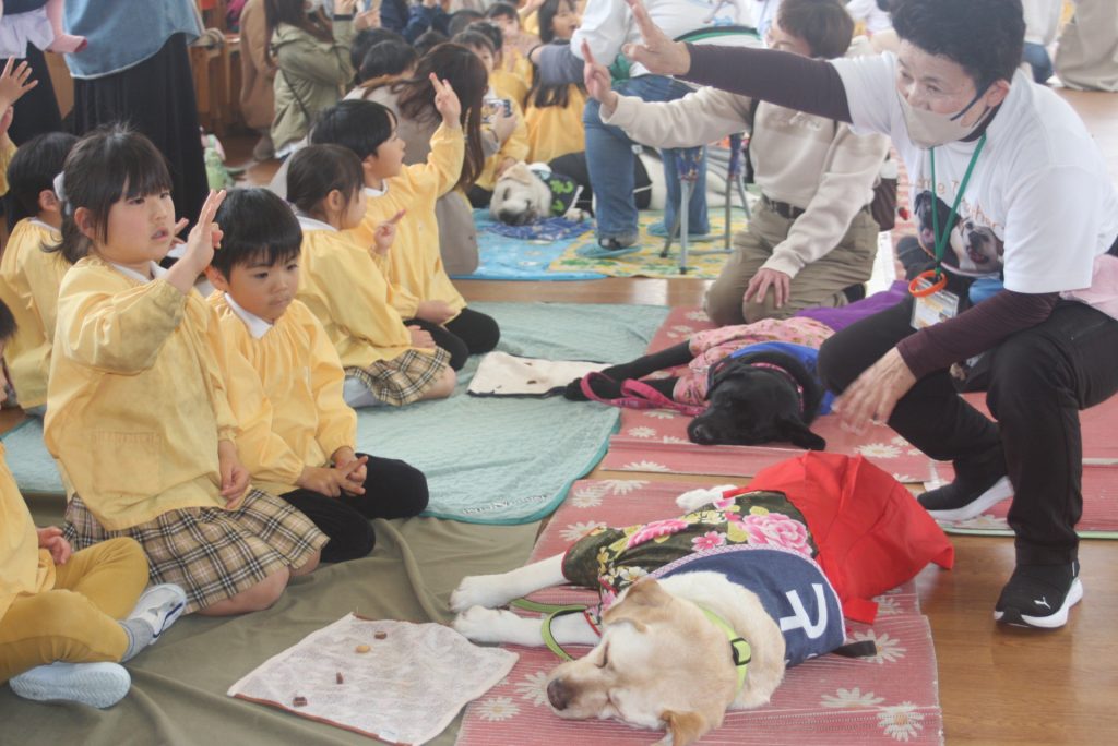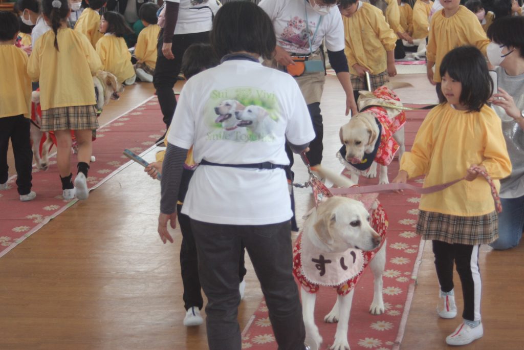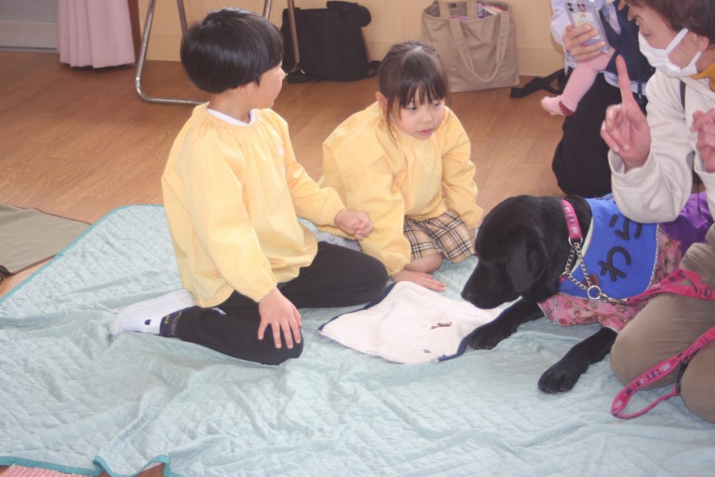 セラピードッグとふれあおう 青学年 2026年02月27日 青学年(年長児) 今日は、マロン・セラピードッグ協会から17頭のセラピードッグと17名のセラピストの皆さんにご来園いただき、「セラピードッグとふれあおう」の体験活動を行いました。最初は、大きな犬に驚いていた子どもたちですが、次第に慣れ、やさしく背中をなでる姿がまさに癒しの場面でした。多くの保護者様にも、ご参観いただき、子どもたちは卒園前に楽しいひと時を過ごしました。