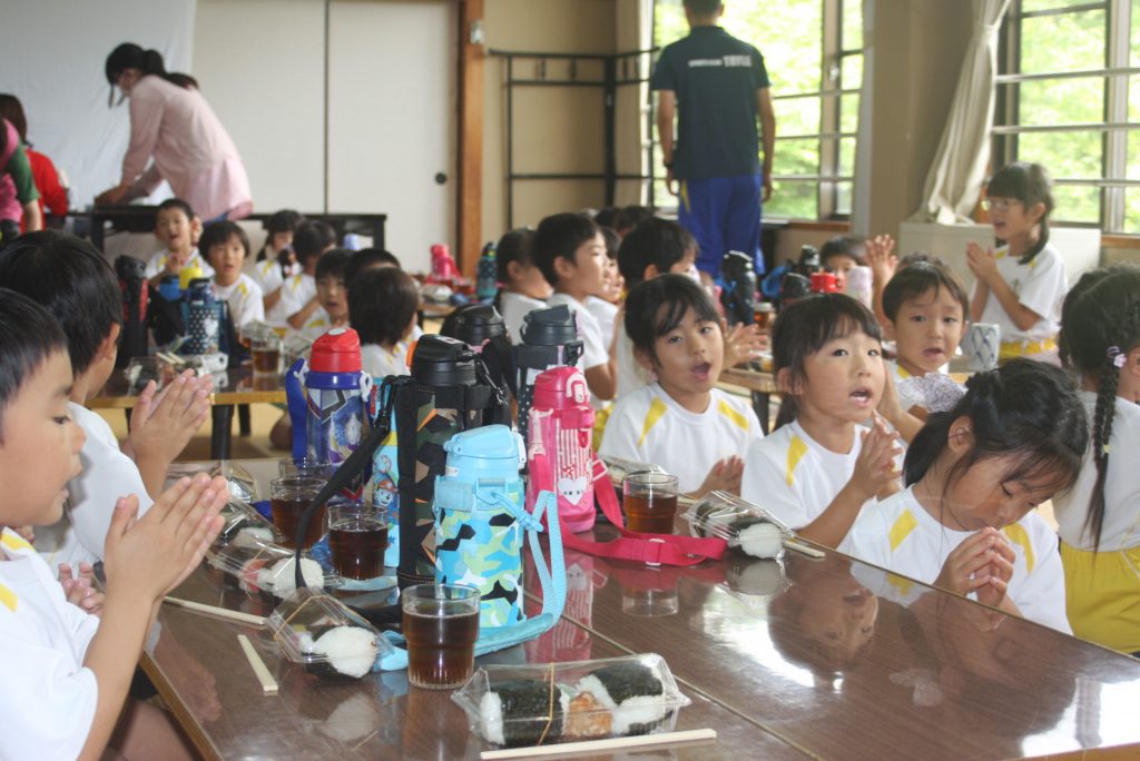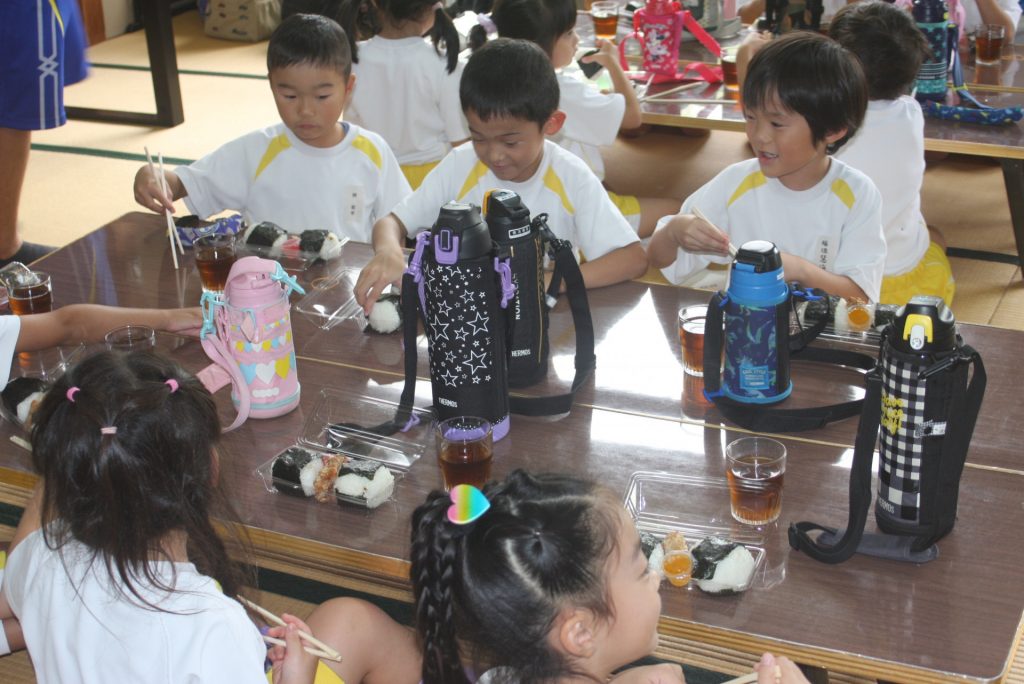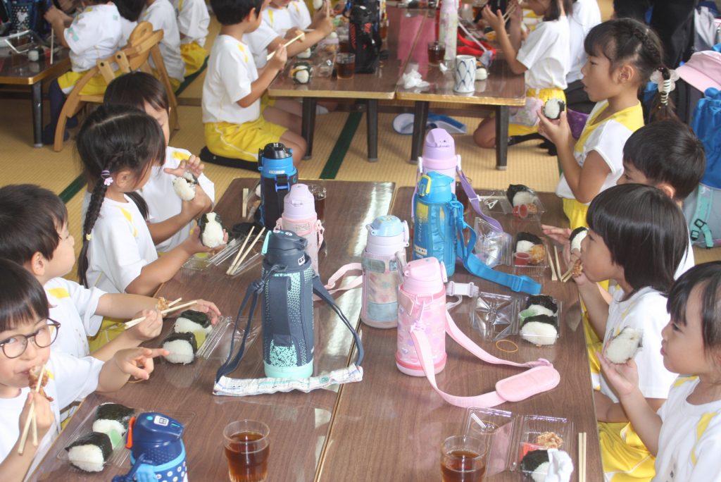 少し遅れましたが、おにぎり弁当をいただいています。