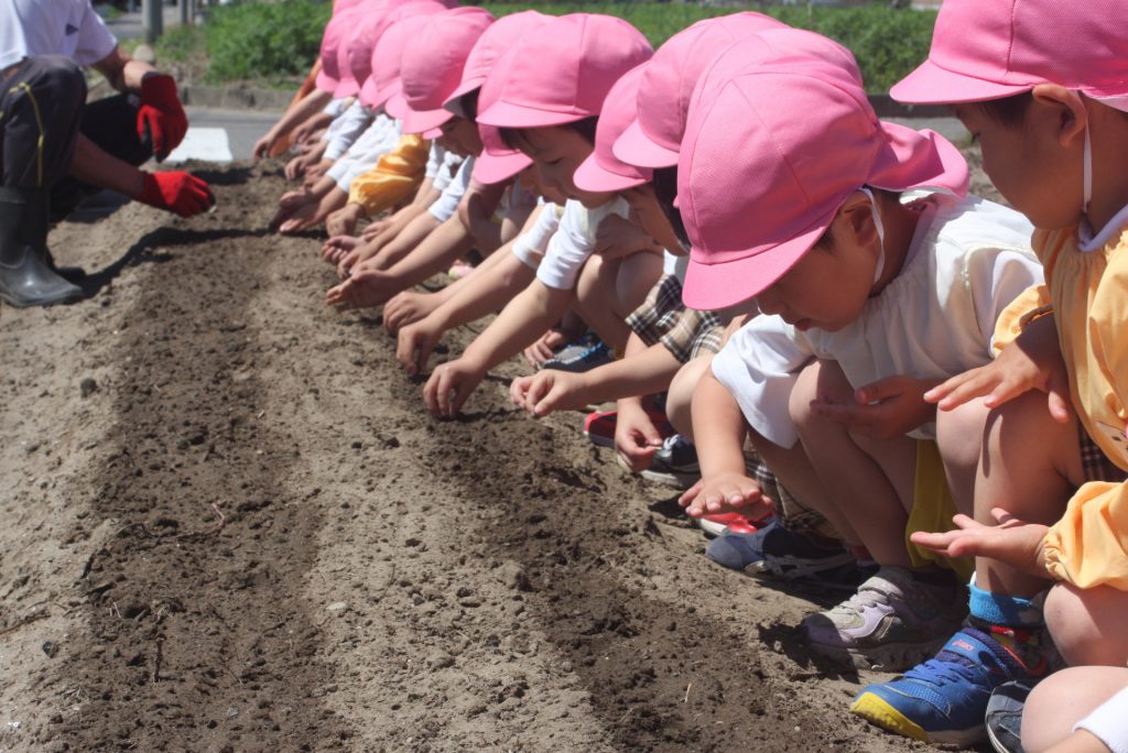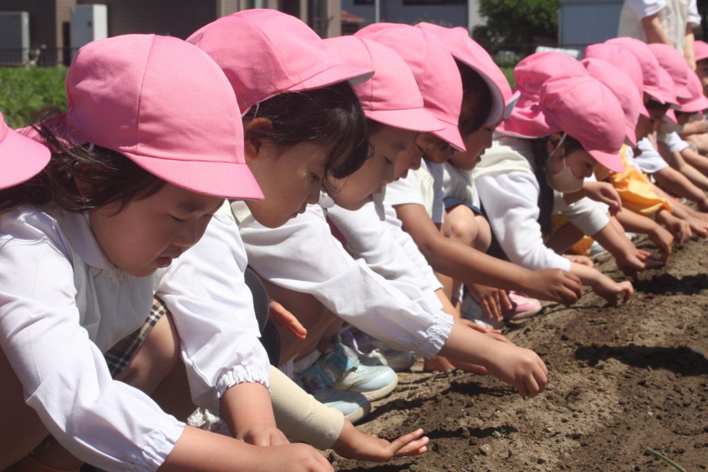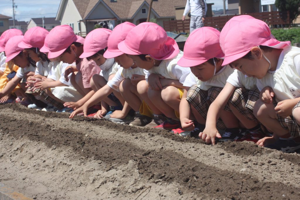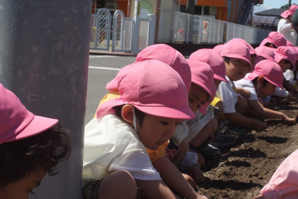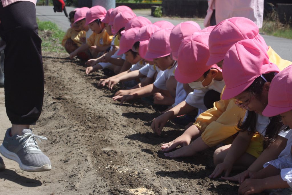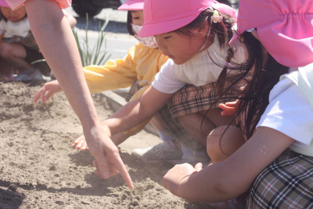 ヒマワリの種まき 2024年05月08日 桃学年(年中児) 桃学年は、午後にヒマワリの種をまきました。小さな筋の模様が入った種です。園児が、愛おしそうに種を眺め、丁寧にまく姿が印象的でした。芽が出るのが楽しみですね。