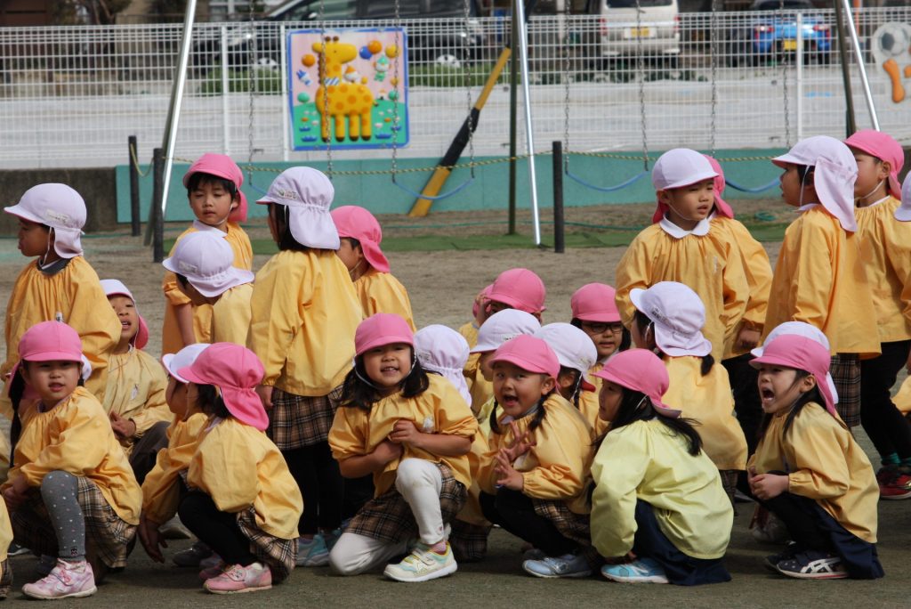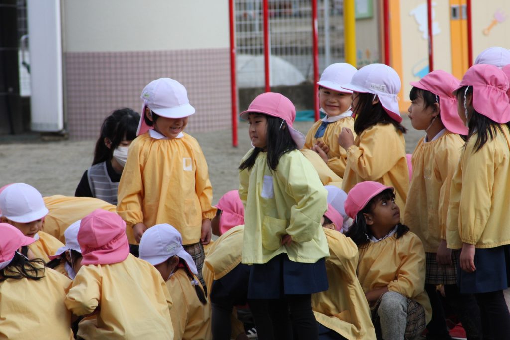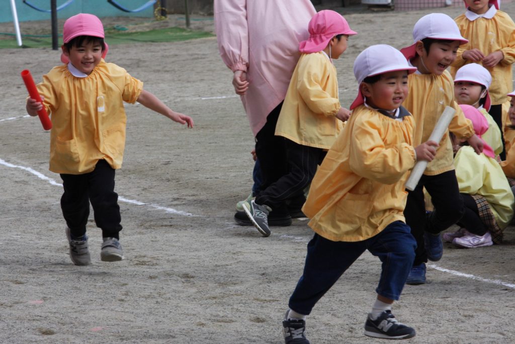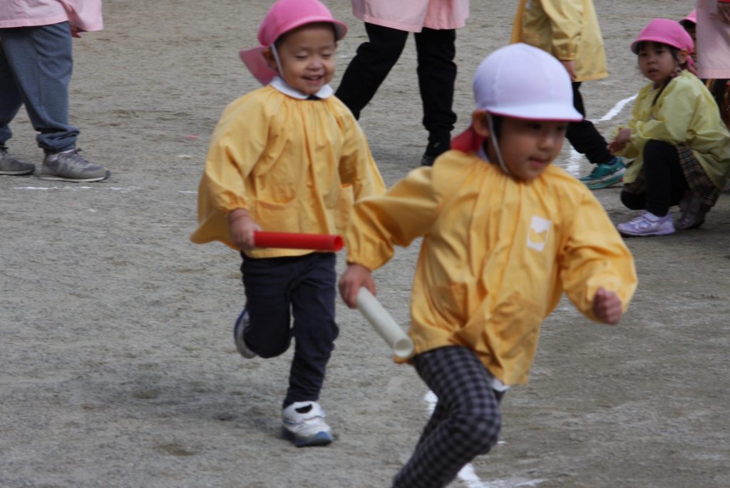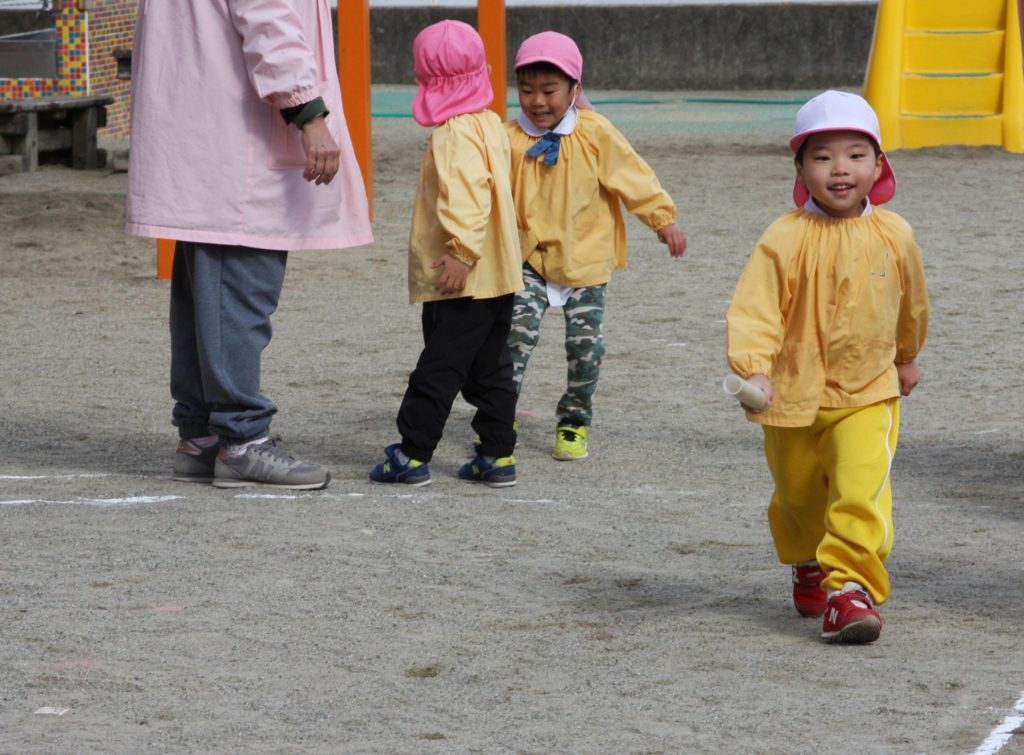 リレーの練習 桃学年 2025年02月10日 桃学年(年中児) 午後、園庭には友だちを応援する声が響きました。桃学年(年中)が、リレーの練習を行っています。初めてバトンを握り、何ともかわいらしい走りです。