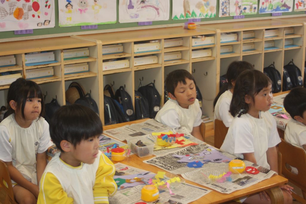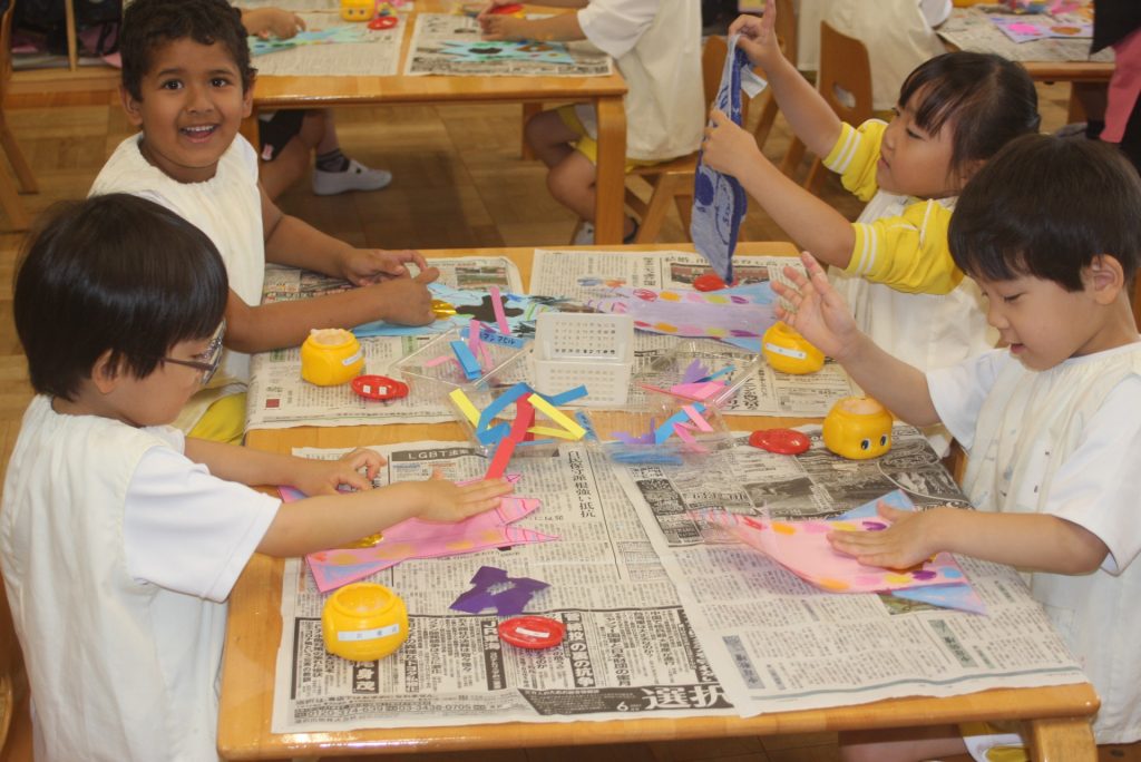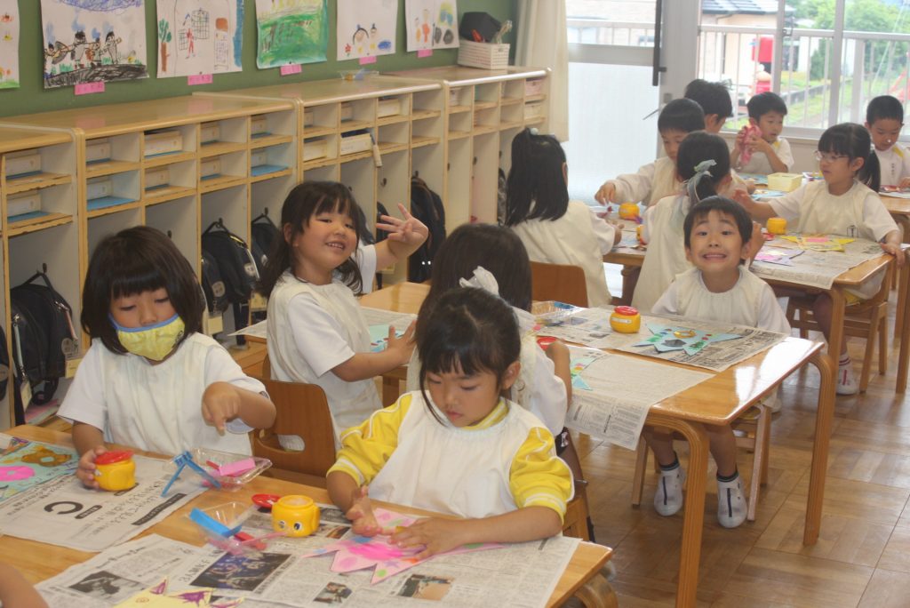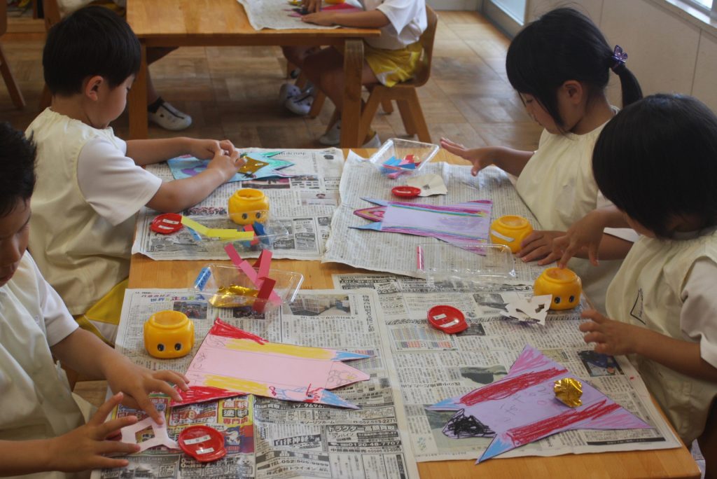 ロケット(七夕笹飾り) 2024年05月27日 青学年(年長児) 制作で「七夕笹飾りーロケット」をつくりました。切り絵を貼ったり、折り曲げて立体的にしたりと難しい作品です。さすが年長青学年。みんな、がんばっています。