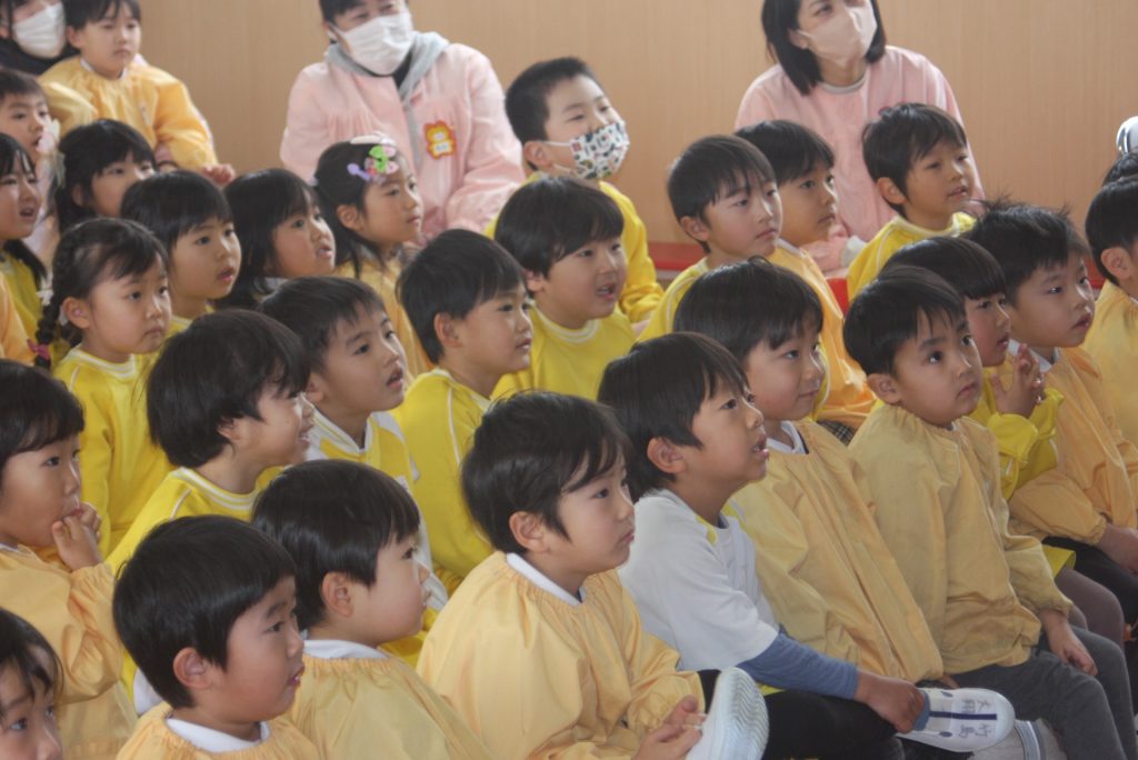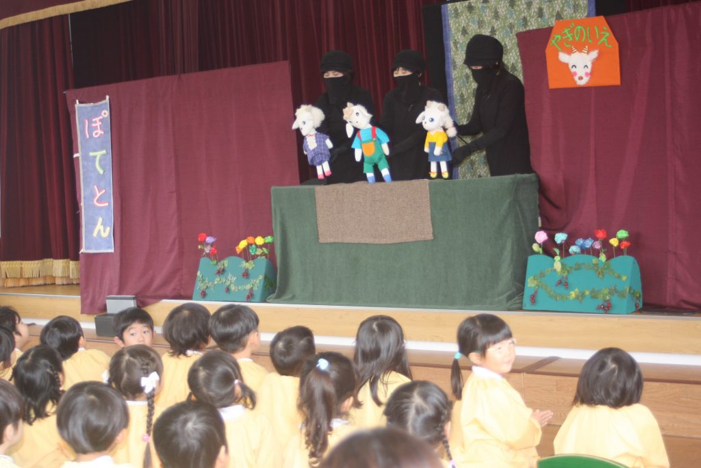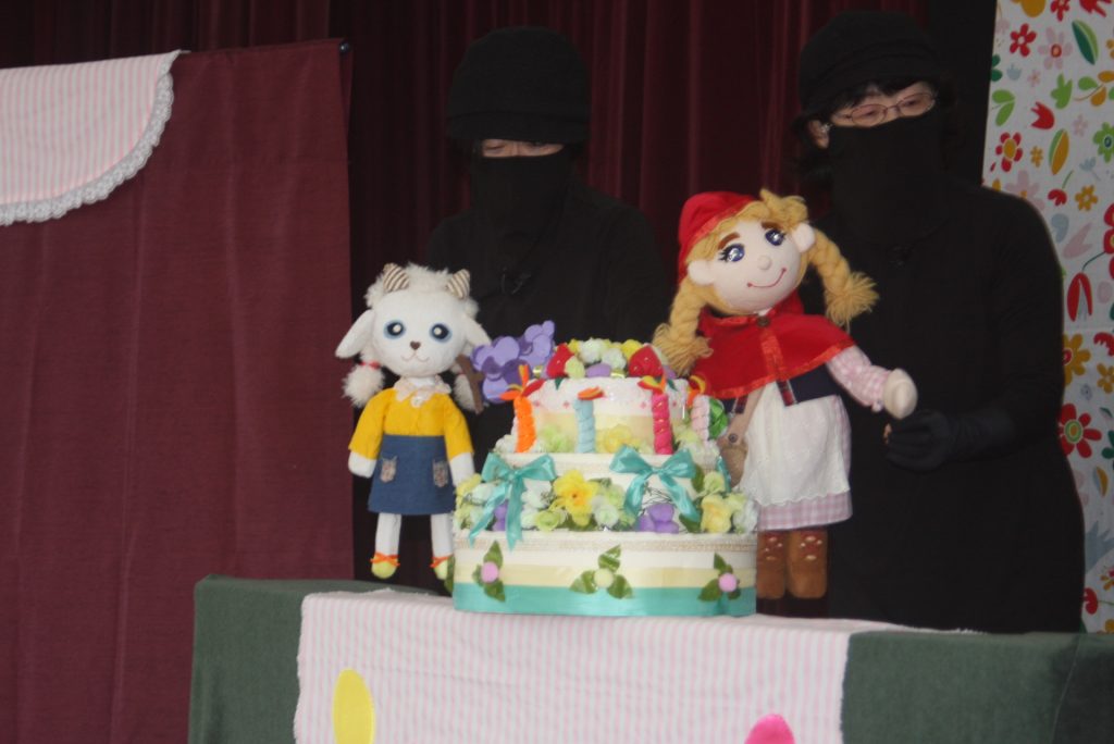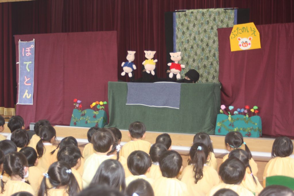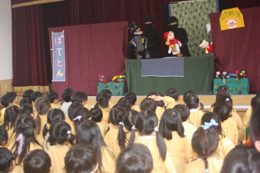 人形劇の鑑賞 2025年02月12日 園の様子 愛園会が主催してくださった「人形劇」を鑑賞しました。今年も、「ぽてとん」さんに来ていただき「赤ずきんちゃんのお誕生日会」を演じていただきました。子どもたちは、大喜びです。