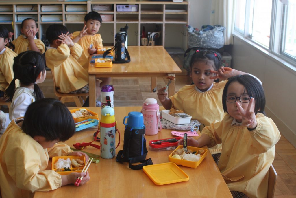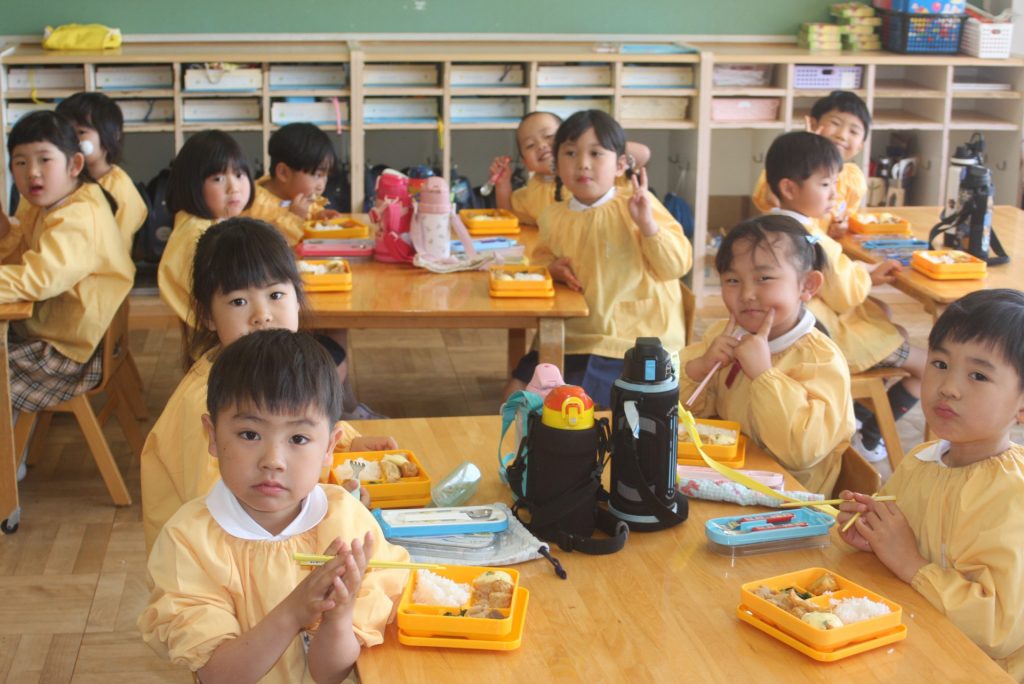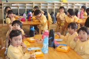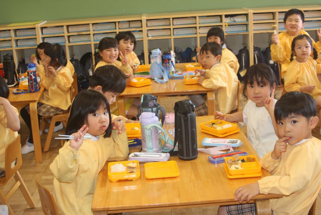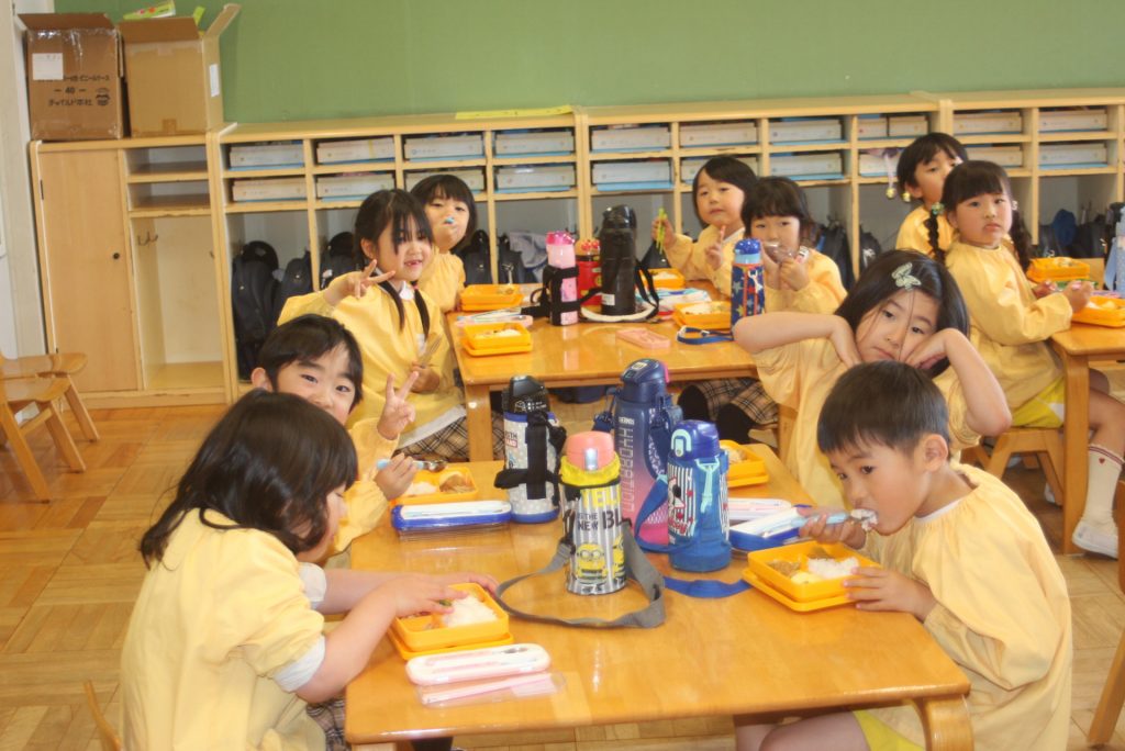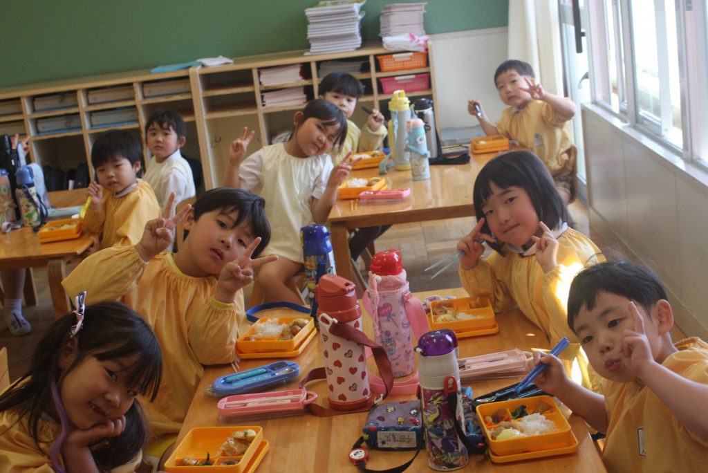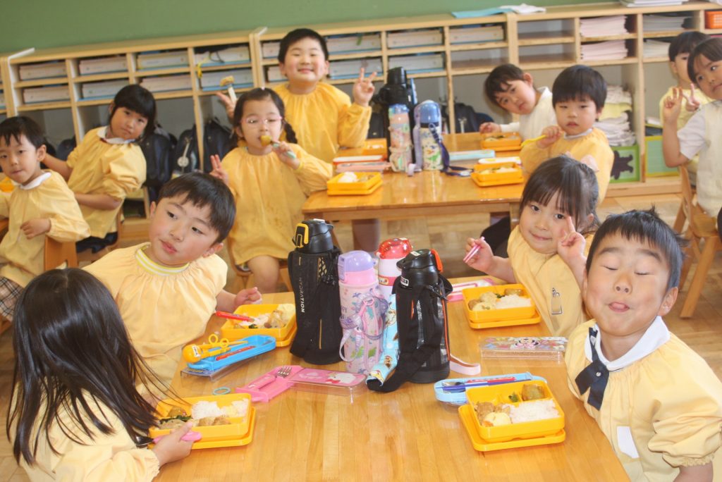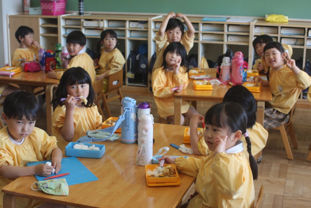 今日の給食 2025年04月09日 青学年(年長児) 給食の時間の青学年(年長)の様子です。みんな元気にモリモリ食べています。献立:ごはん、蟹玉中華あん、餃子、揚げ鶏団子、筑前煮、茹でもやし、ほうれん草のおひたし、大学芋