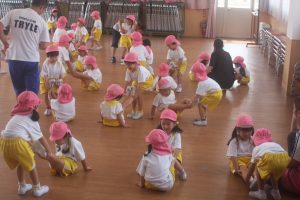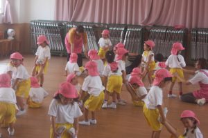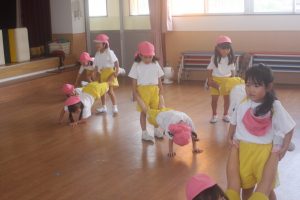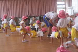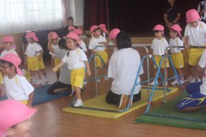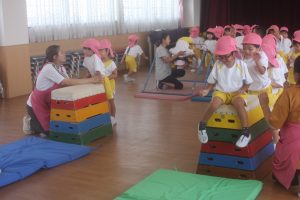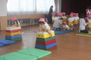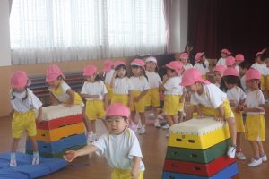 今日は、体育教室がありました。桃学年(年中)では、鉄棒前回り、跳び箱、マットで「グッパッ」の練習を行いました。今日は、幼保小連携の活動として、柏森小学校の先生が見学にみえました。みんな、かっこいい所を見せれましたね。