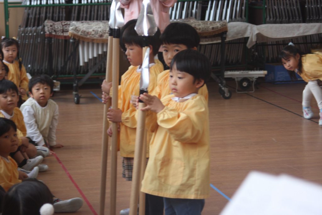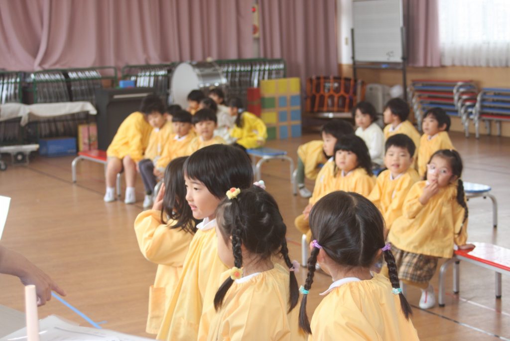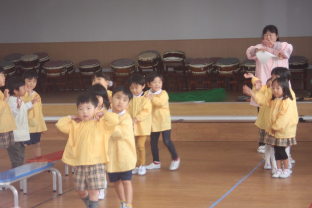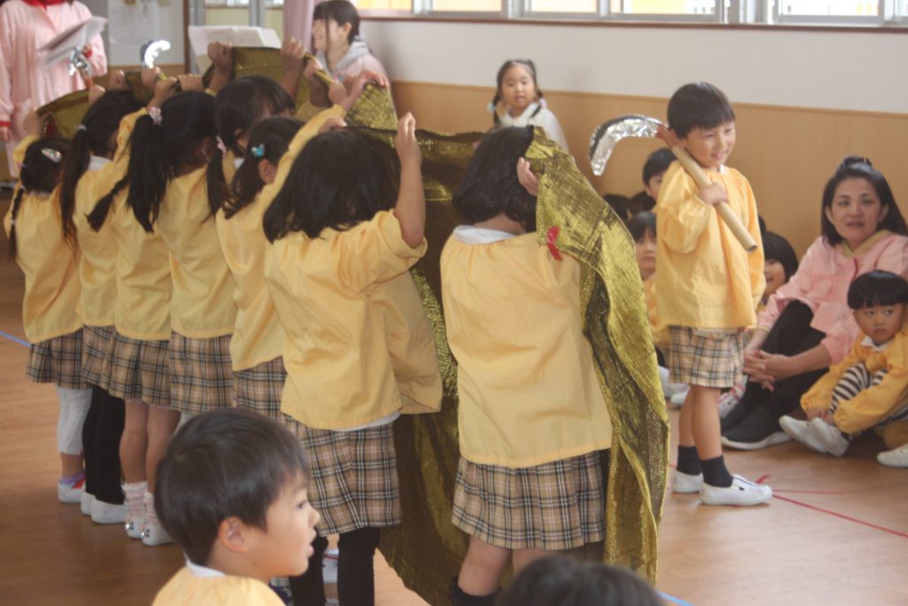 劇の練習 2024年11月20日 桃学年(年中児) 今日は、遊戯室で劇の練習をしました。クラスの発表を互いに見て、勉強しました。人に見られることは、緊張します。本番は、もっと大勢の人に見てもらいます。自信をもって、役を演じましょうね。