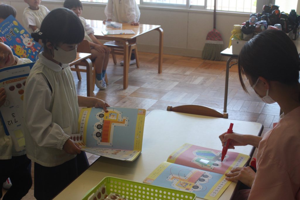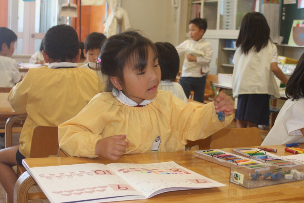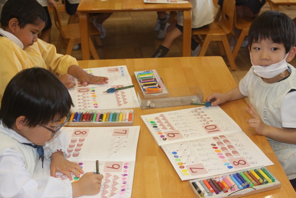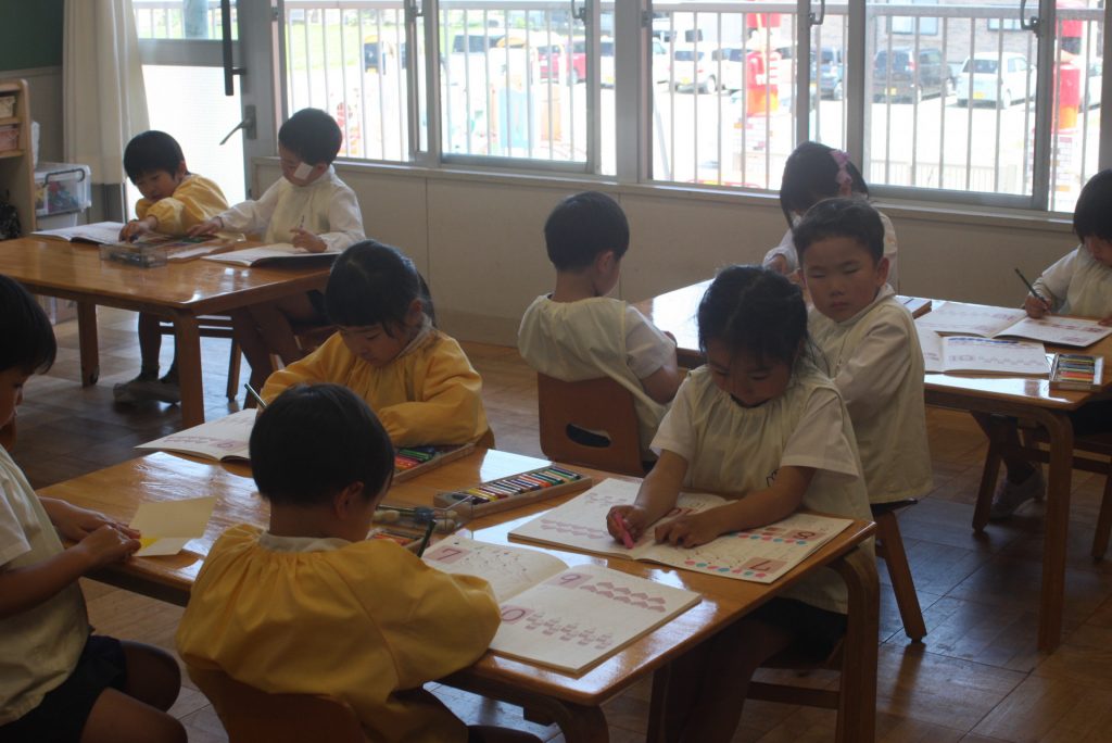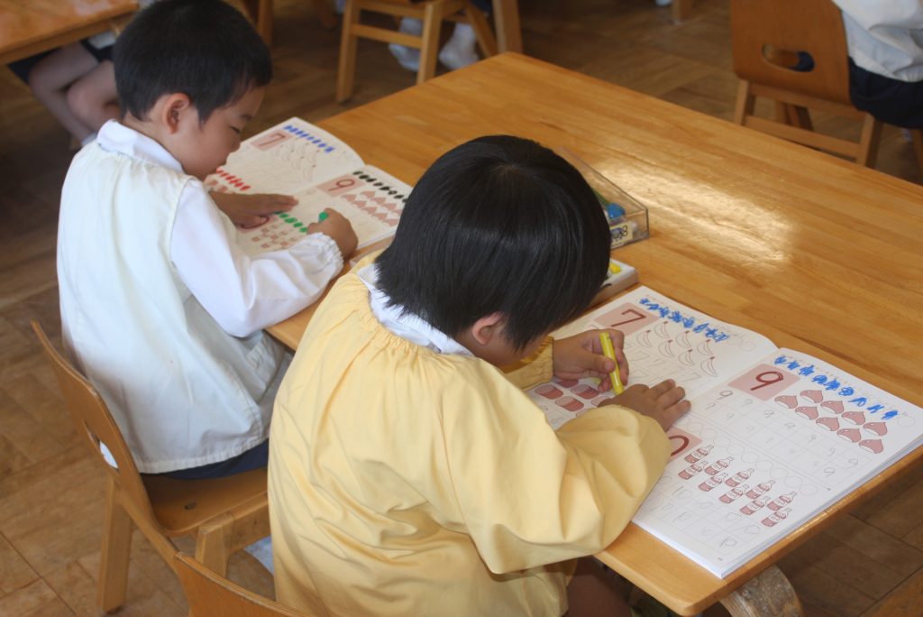 青学年の午後の学習の様子です。象組・きりん組は、「あいうえお123」「数2」を学習していました。みんな真剣な表情で取り組んでいます。