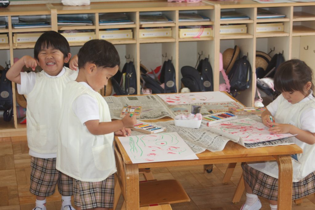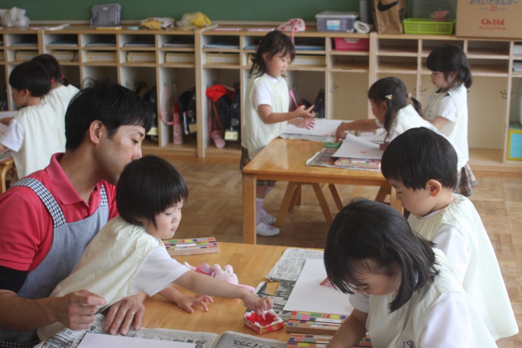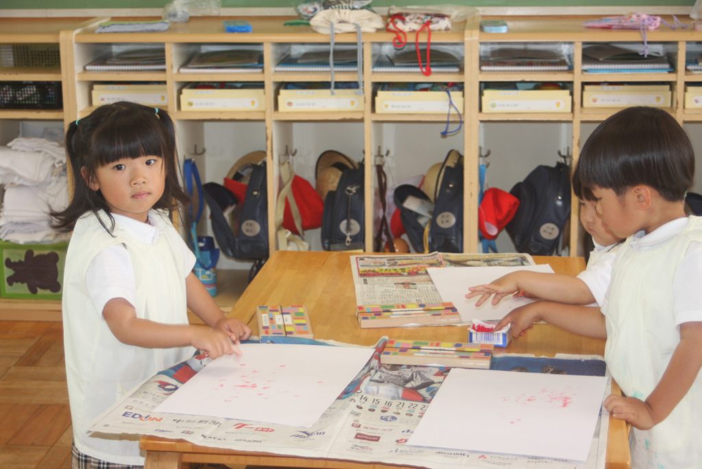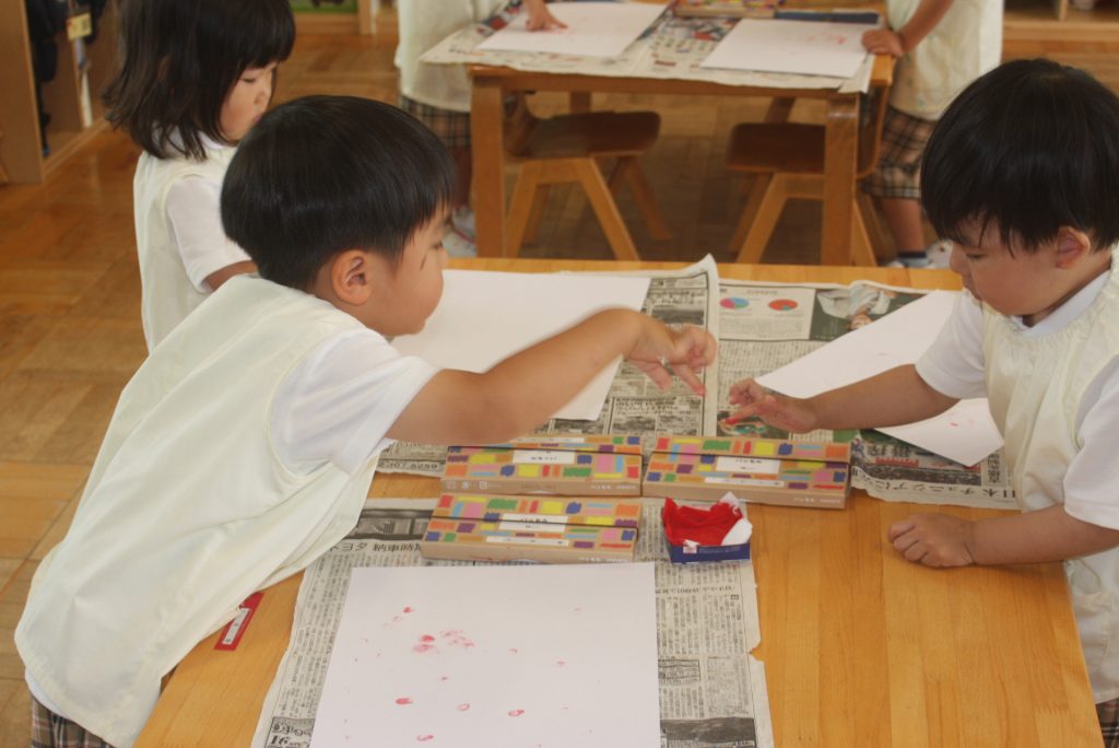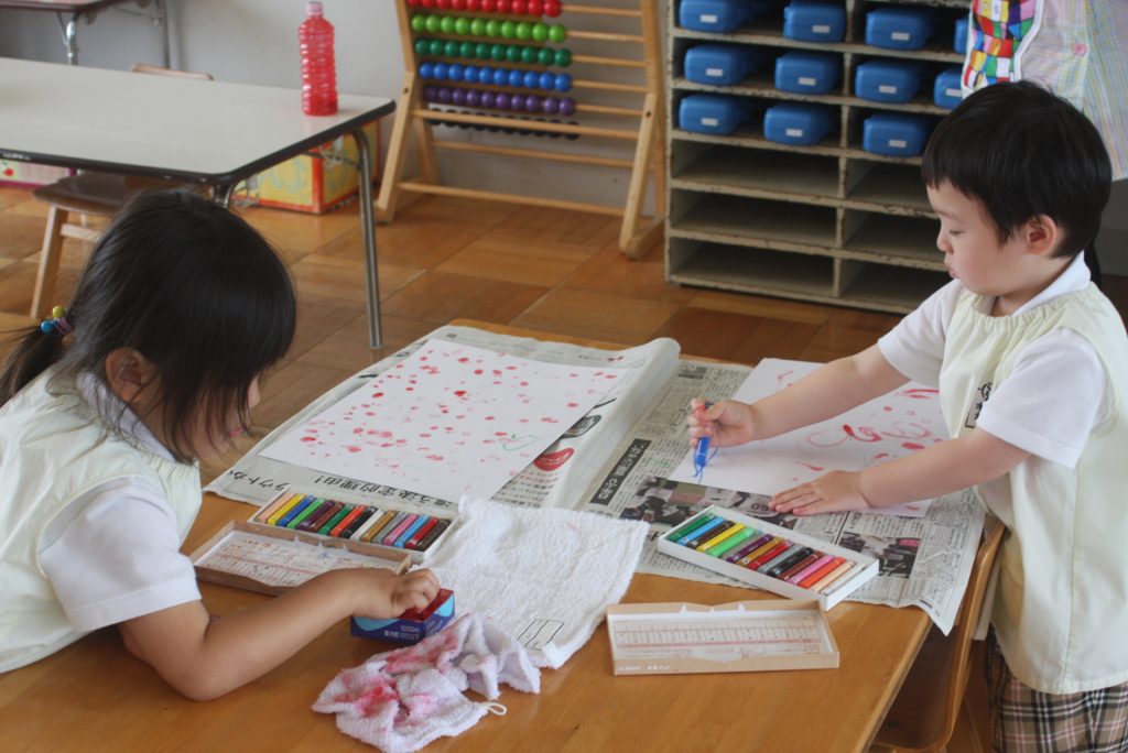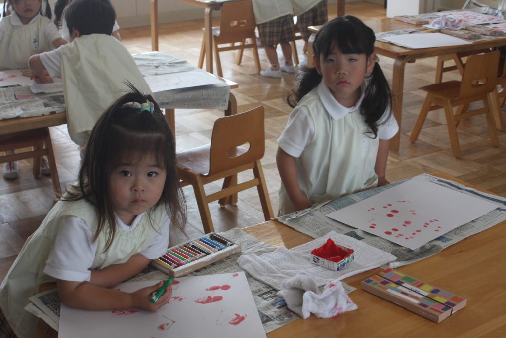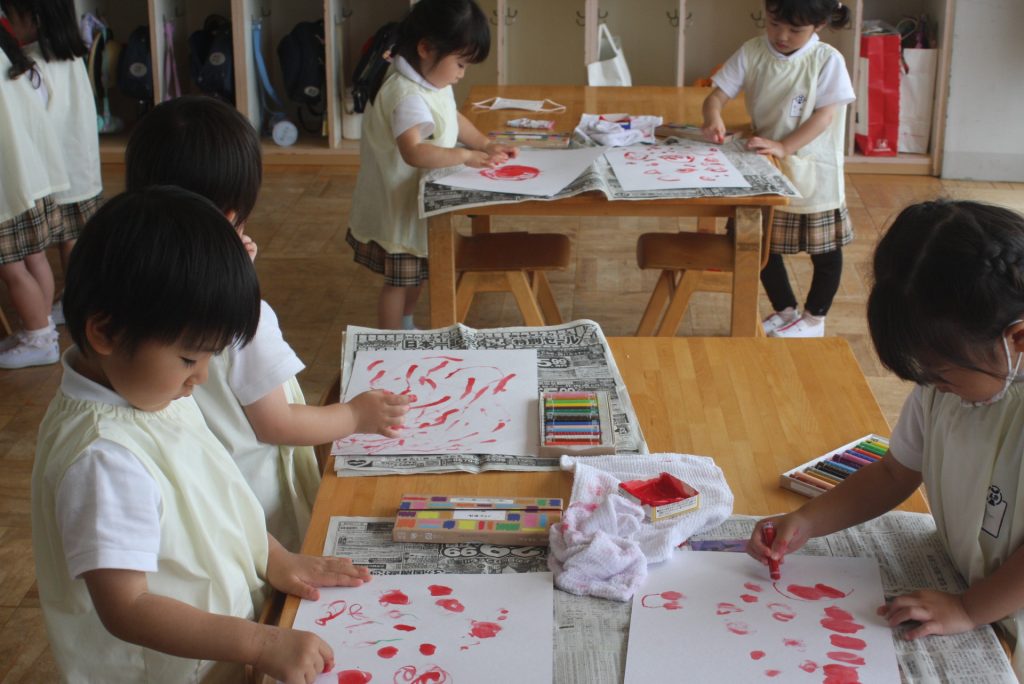 参観週間4日目(赤学年) 2024年05月23日 赤学年(年少児) 参観週間4日目です。45名ほどの保護者様にご参観いただきました。本日の赤学年絵画教室では、「サクランボのおやつ」をテーマに作品を制作しました。