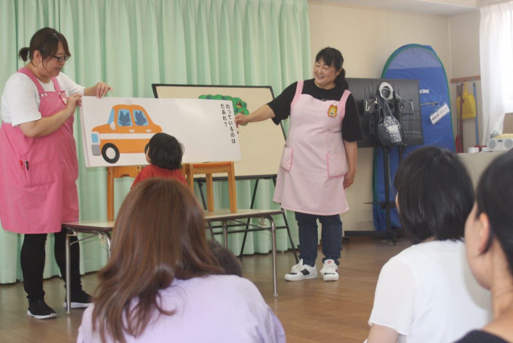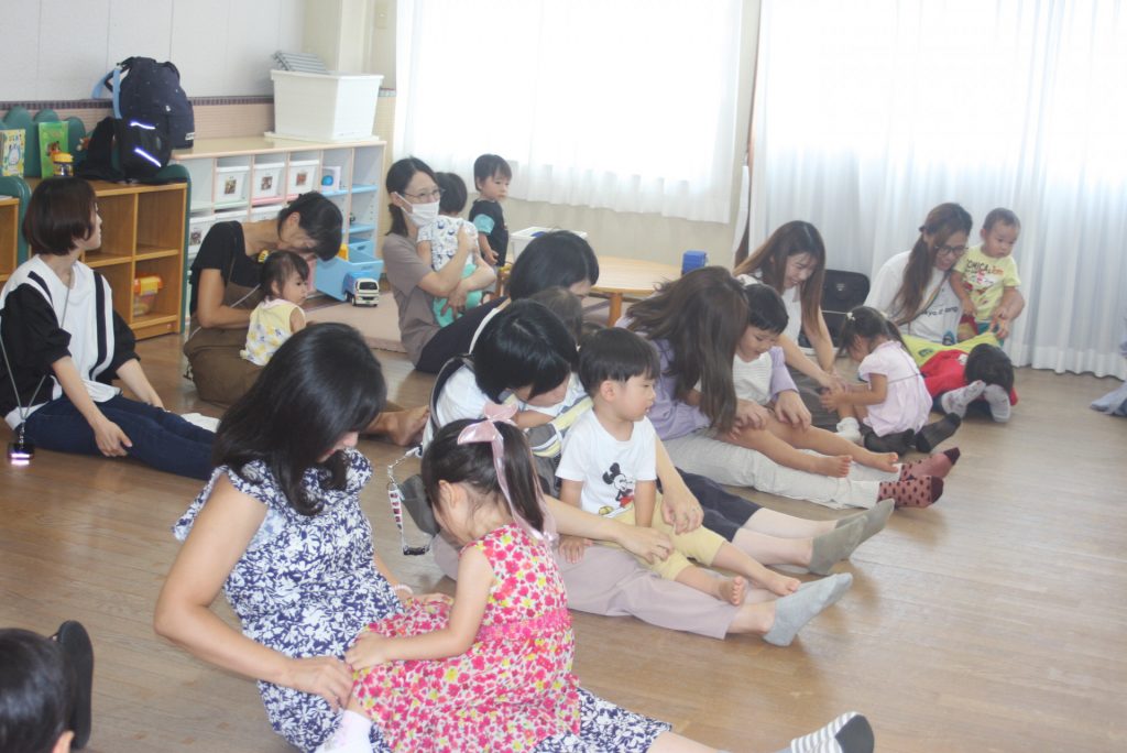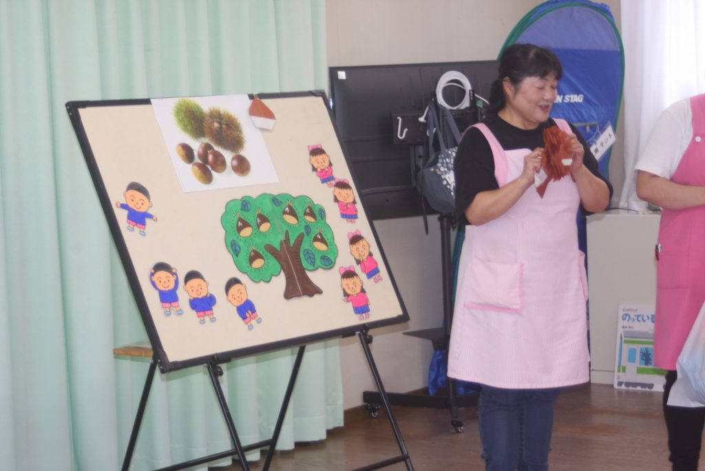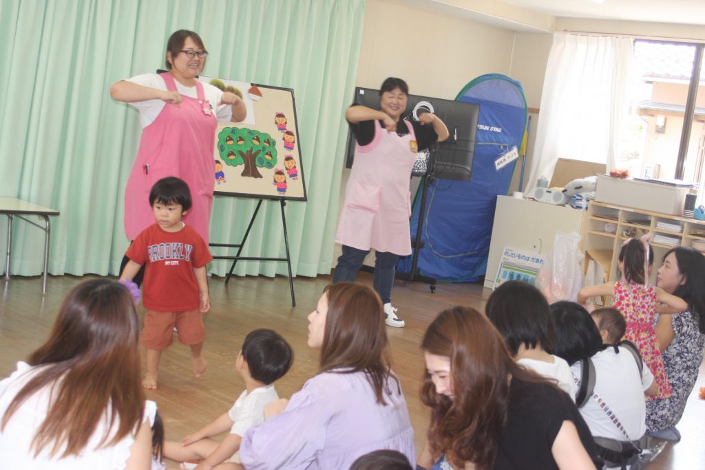 子育て広場9月 2024年09月09日 園の様子 「親子ふれあい遊び」を行いました。子どもたちは、母親の膝の上で大喜びでした。他に大型絵本やパネルシアター、栗の折り紙などもありました。次回、子育て広場は、11月13日(水)です。