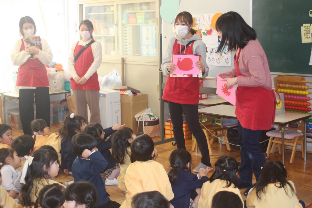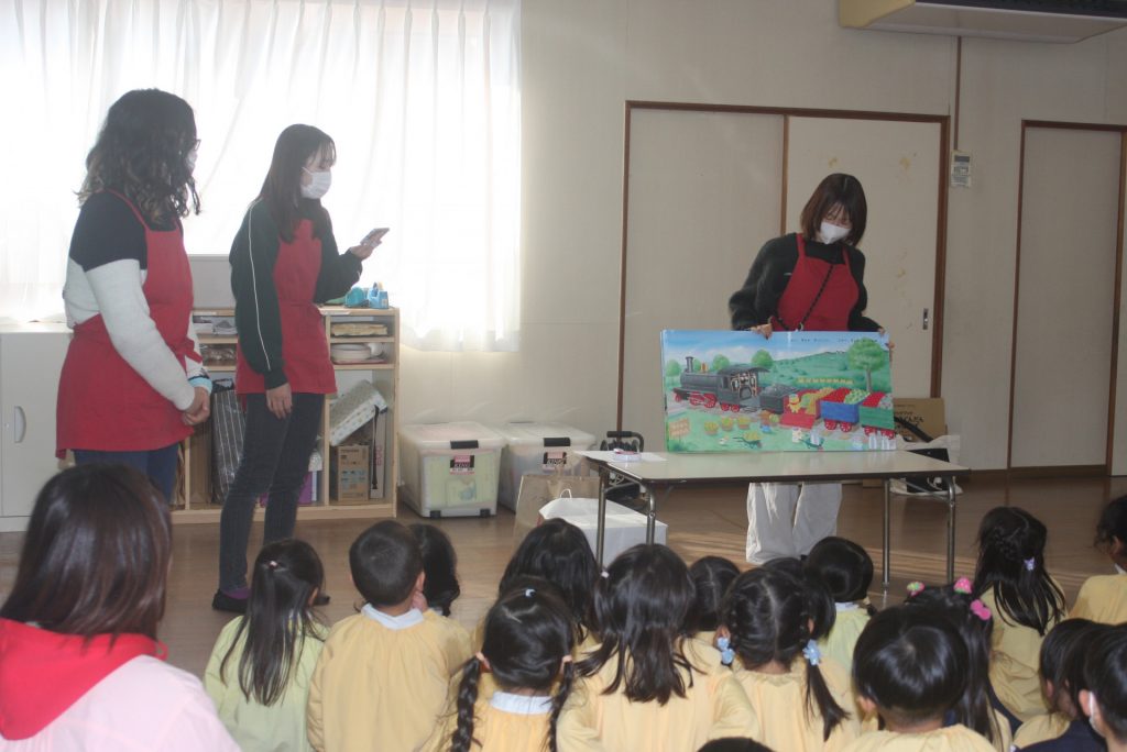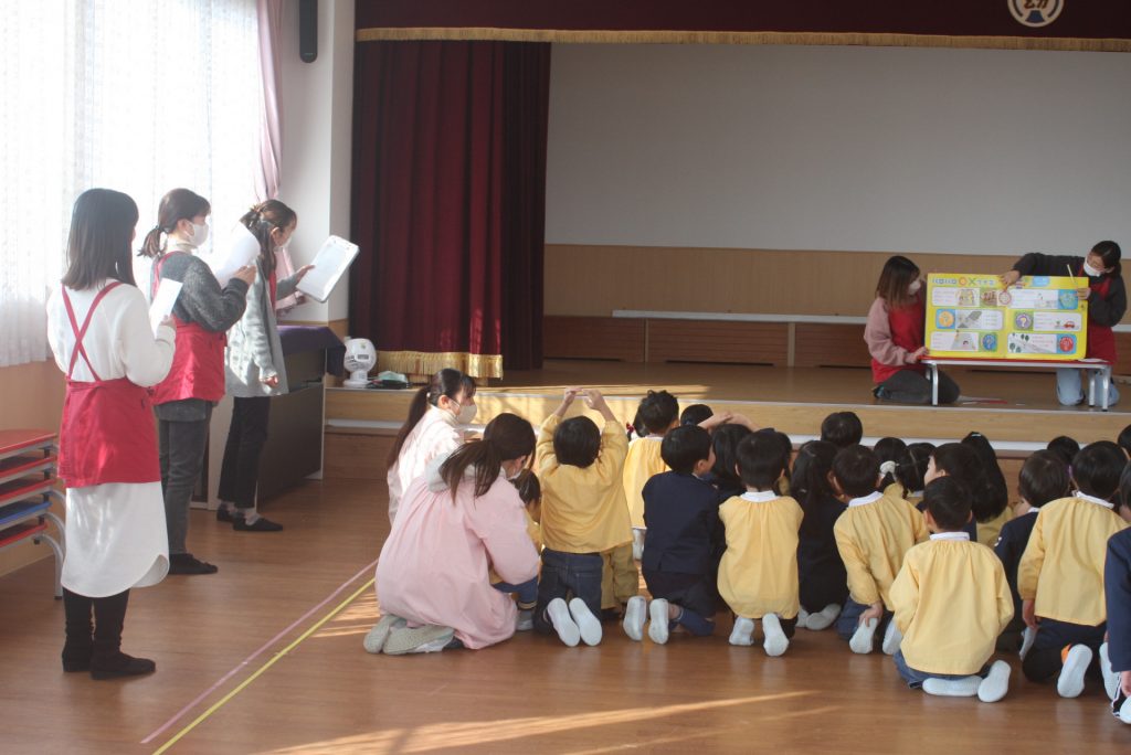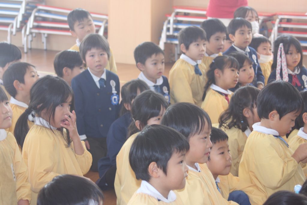 愛園会 読み聞かせ 2025年01月14日 愛園会 午後は、愛園会役員・委員の皆様に読み聞かせを行ってもらいました。絵本や紙芝居の読み聞かせでは、子どもたちは前のめりになり真剣な表情で聞き入ってました。クイズでは、大いに盛り上がり楽しいひと時となりました。本当にありがとうございました。