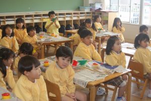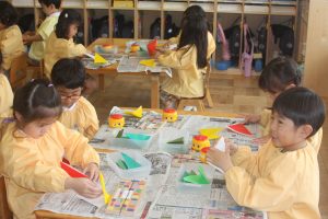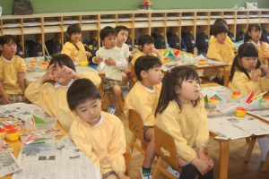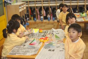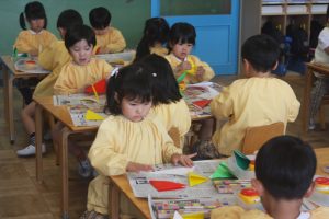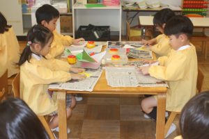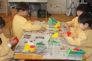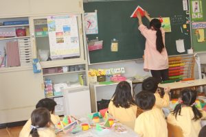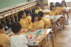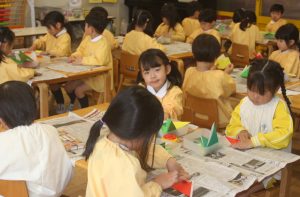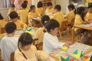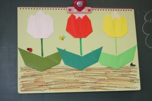 折り紙 チューリップ 青学年 2026年04月15日 青学年(年長児) 青学年(年長)では、折り紙でチューリップの制作を進めていました。折り紙は、日本が誇れる文化で、幾何学的な思考を育む優れた教材と言えます。苦戦しながらも、丁寧に折る姿は、さすが青学年さんです。