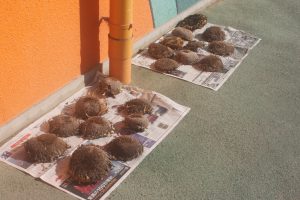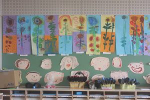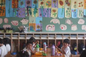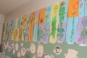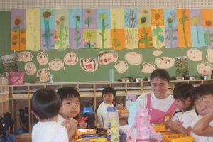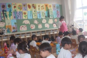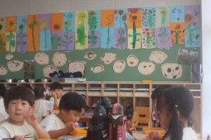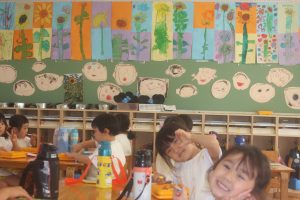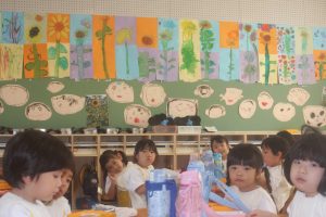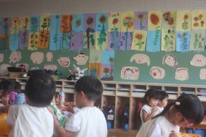 桃学年(年中)の教室には、ヒマワリがいっぱい咲いています。画用紙を2枚貼り合わせ、そこに思い思いのヒマワリを描きました。迫力があります。また、種から育て、見事に咲いたヒマワリの種を9日(火)に取る予定です。