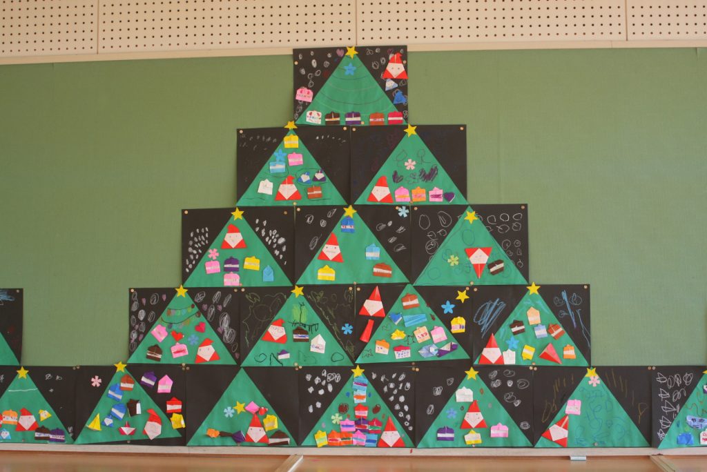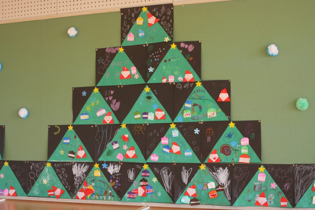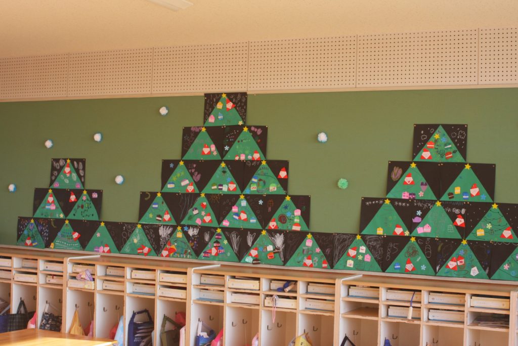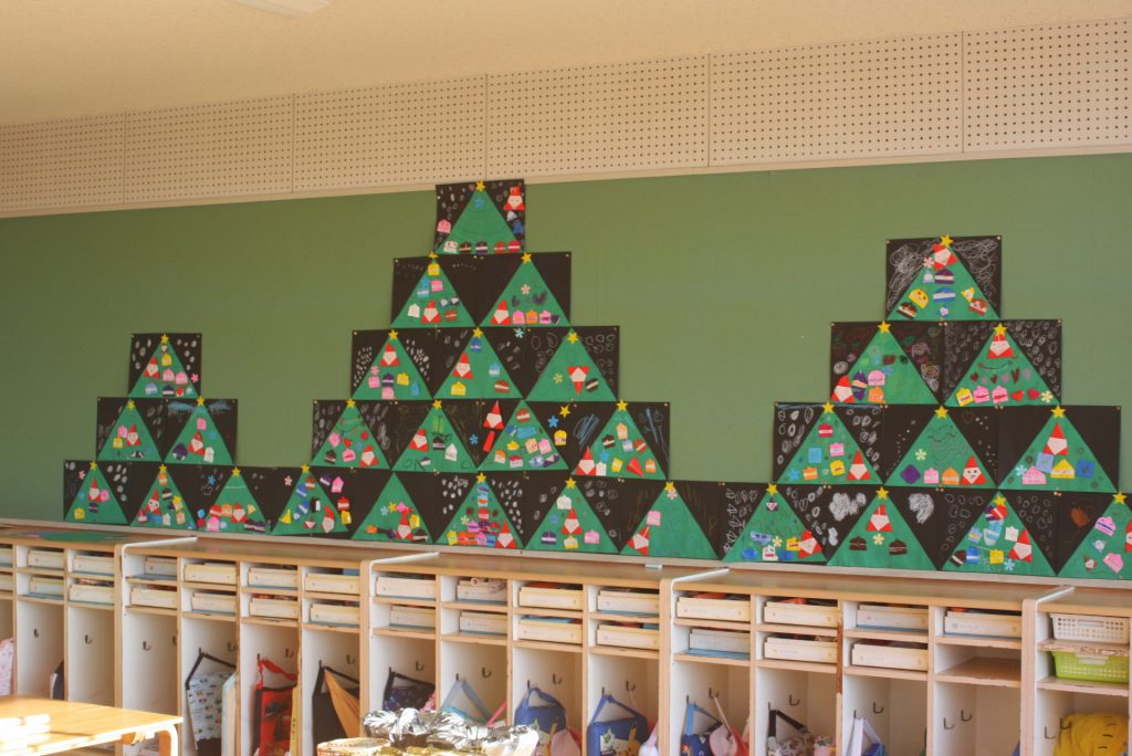 桃学年の教室壁面は、子どもたちが制作した「クリスマスツリー」が飾られています。保護者会で、ご来園の際はぜひ見てください。