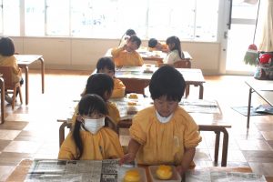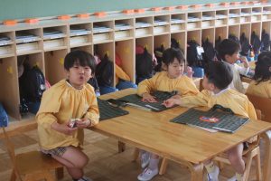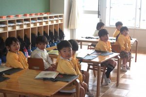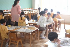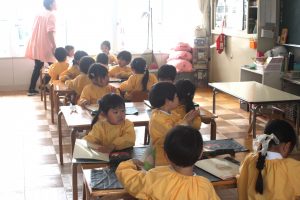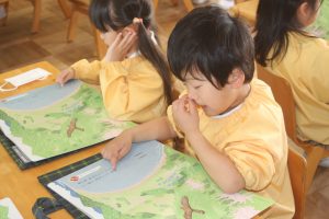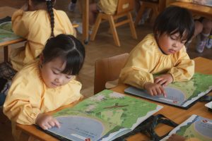 避難訓練を終えて、桃学年(年中)では、平常の学習や制作の活動に戻りました。漢字絵本は、真剣に読んでいます。制作の準備は、自分の力で協力しながら進めています。