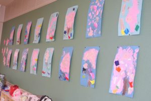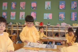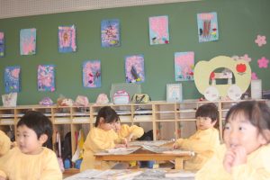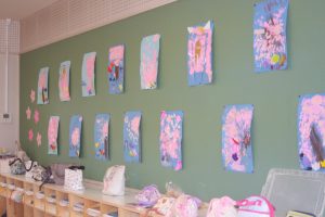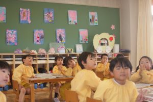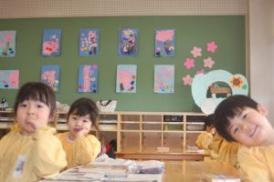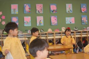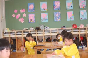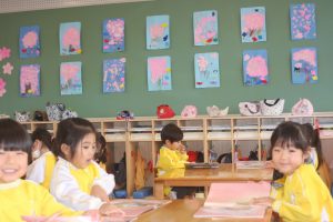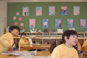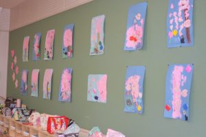 先日、ニュースで「河津桜」が咲き、花見の様子が伝えられていました。赤学年(年少)の壁面は、子どもたちが制作した桜が満開です。