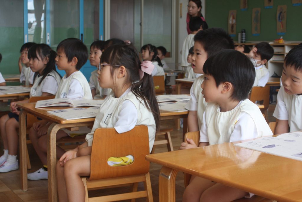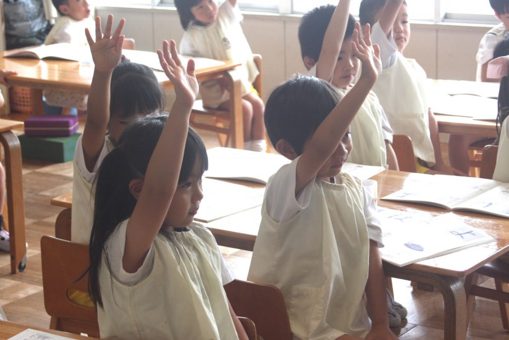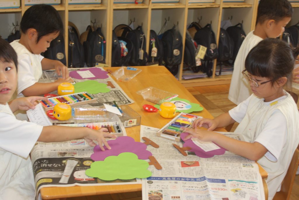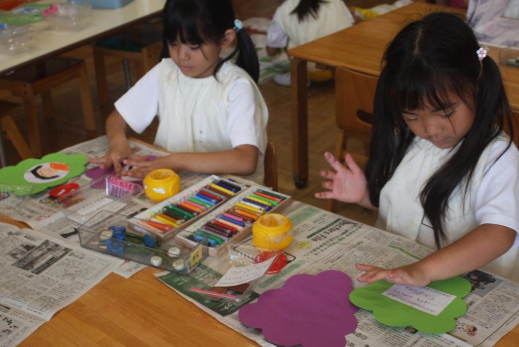 祖父母へのプレゼント、「よ」「ま」 2024年08月26日 青学年(年長児) 青学年(年長)を訪ねると敬老の日に向けて、「祖父母へのプレゼント」を制作していました。心のこもったプレゼントとなりました。その後、ひらがな「よ」「ま」の練習をしました。最後のひっくり返すところが難しいです。