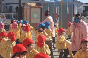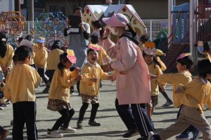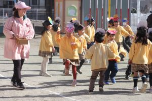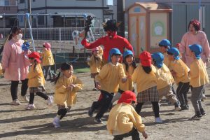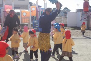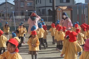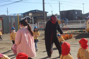 今日は、雑節の「節分」です。朝から、子どもたちは豆まきをし、鬼退治をしました。また、青学年(年長)は、自分が作った鬼の面をかぶり、鬼の役も行いました。