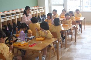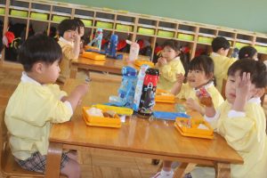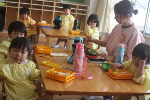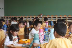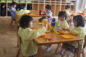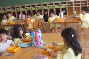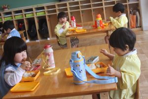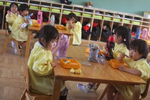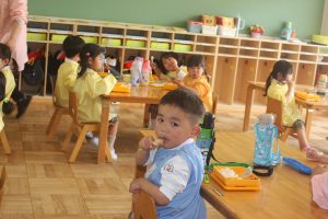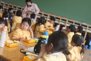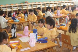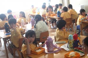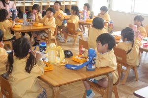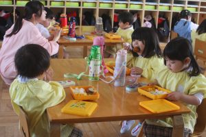 赤学年(年少)、桃学年(年中)の給食の様子です。みんな、モリモリ食べています。食事のマナーもいいですよ。