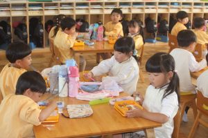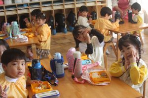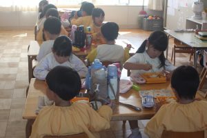 みんな、モリモリ食べています。今日は、みんなの大好きなハンバーグがでました。おいしくいただきました。