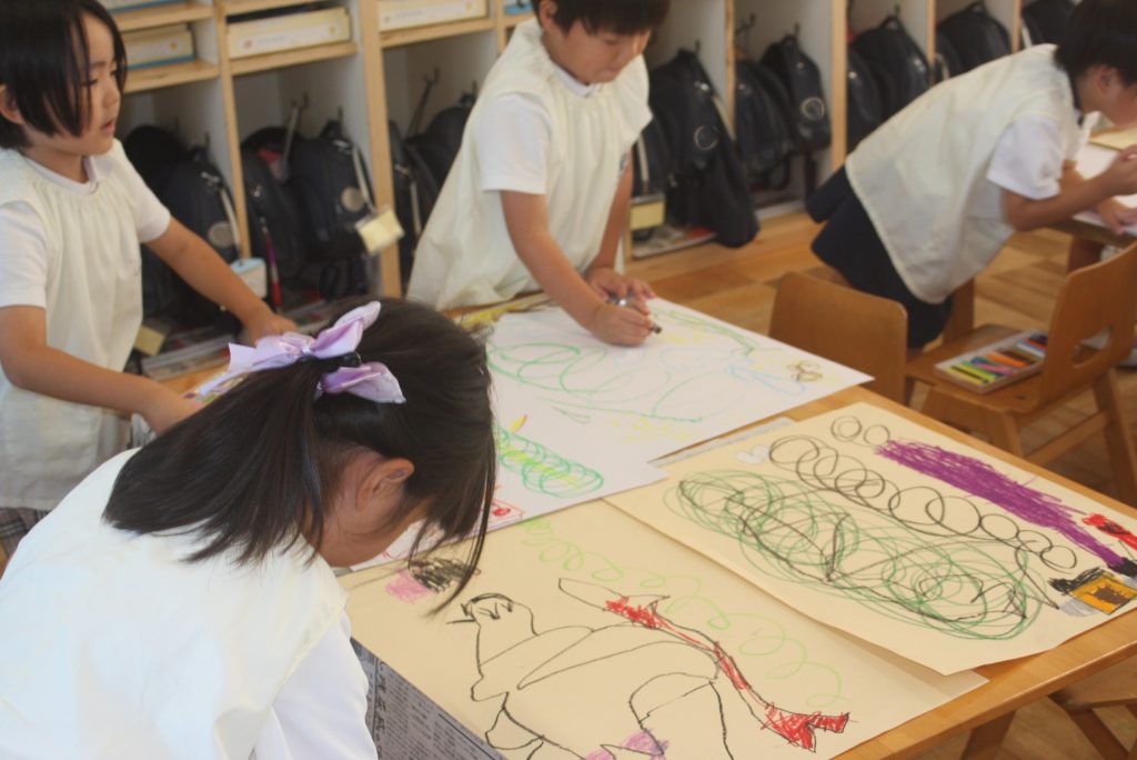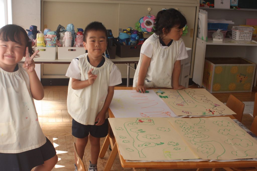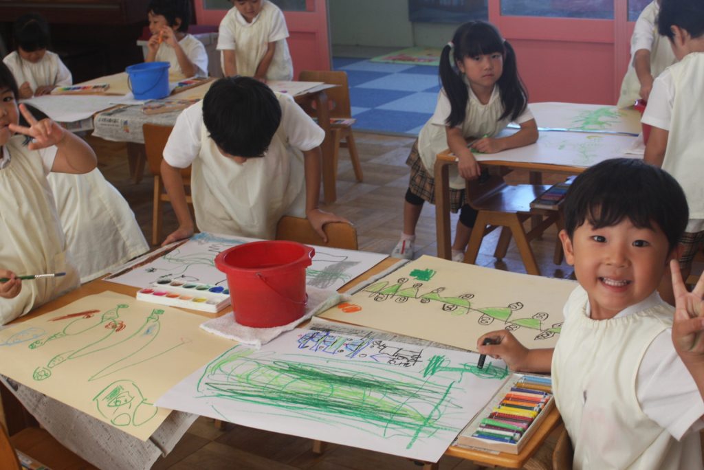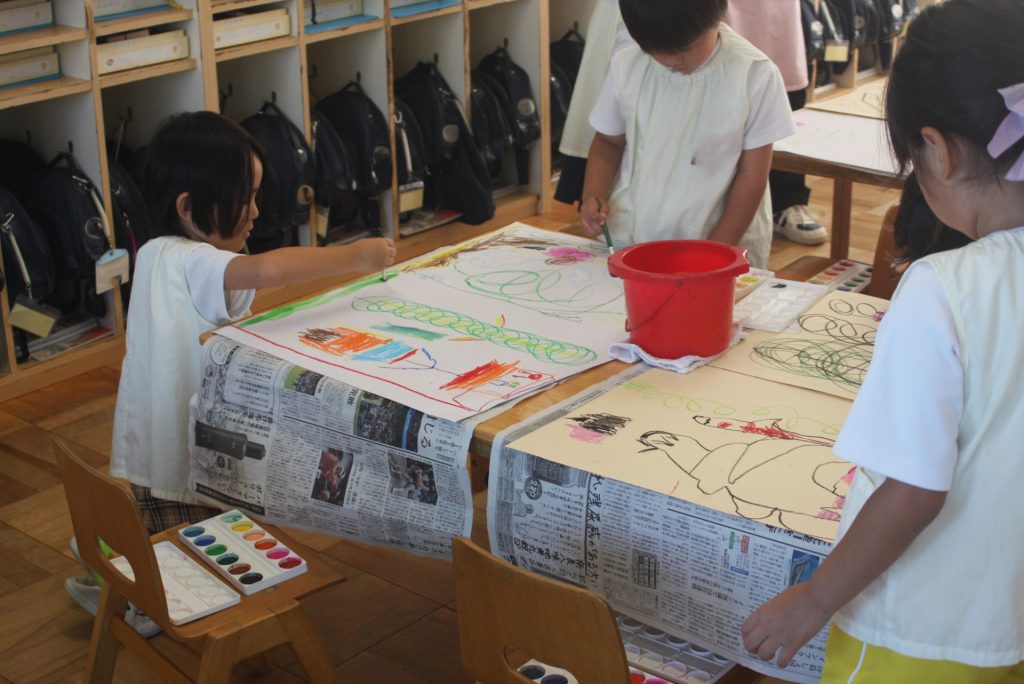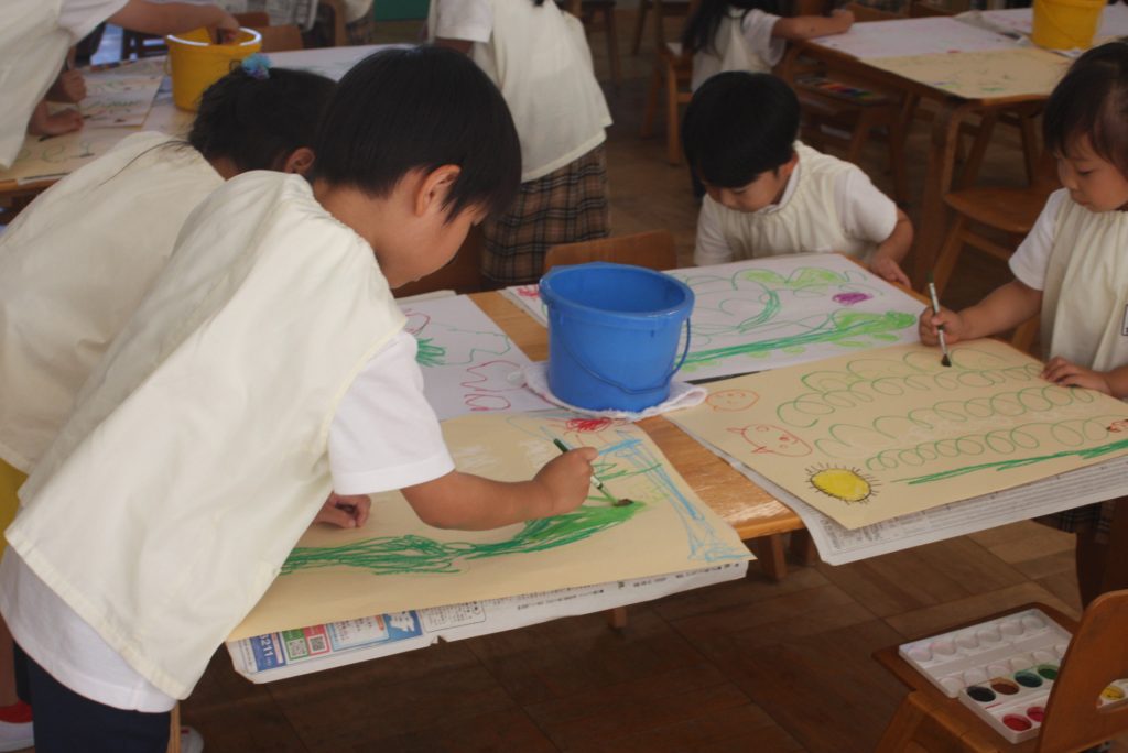 今日は、絵画教室でした。桃学年(年中)では、クレパスと水彩絵の具を使って、ジャックと豆の木をテーマに絵を描きました。