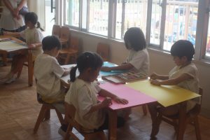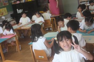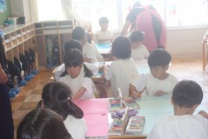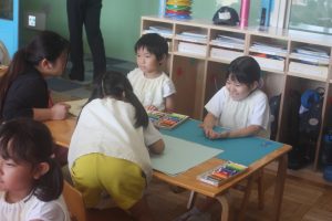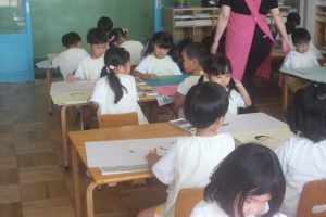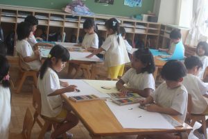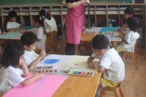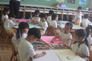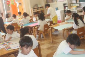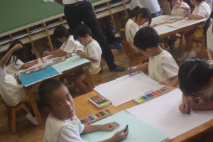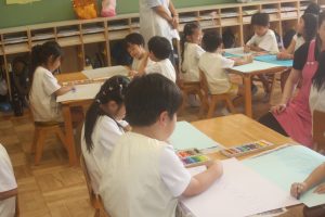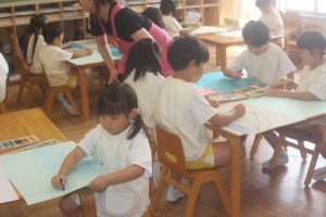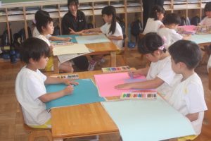 今日は、絵画教室でした。青学年(年長)では、「海の絵」を描きました。クレパス・絵の具を使って、一人一人が思う海のイメージを描きました。出来上がった作品は、第28回南さつま児童生徒美術展に応募します。