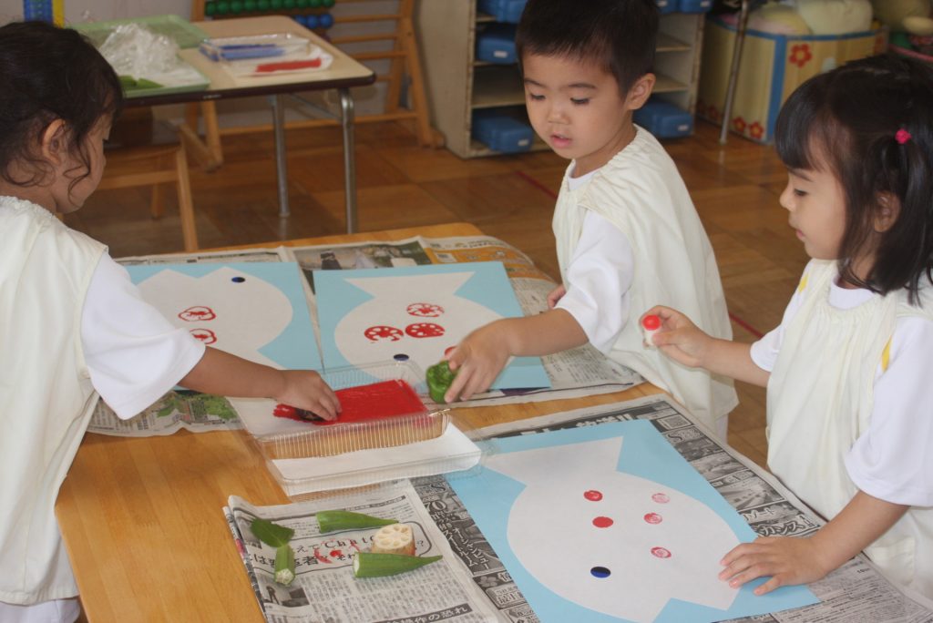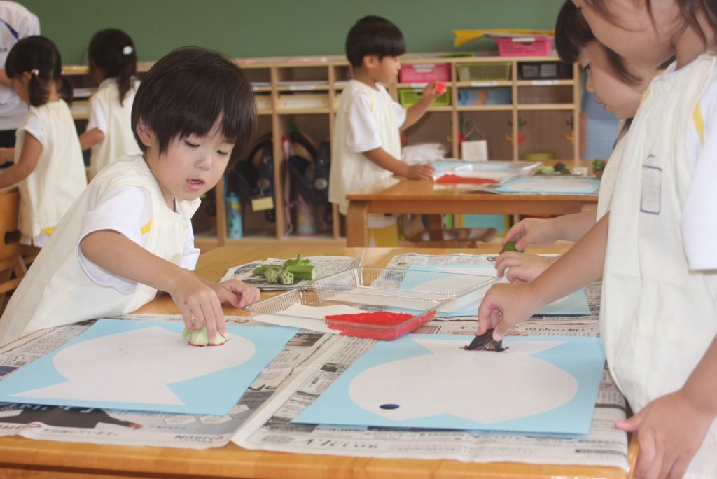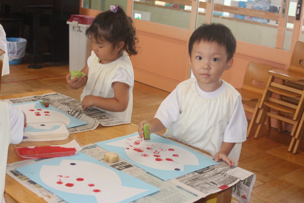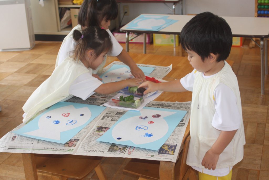 オクラ、ナス、ピーマンのヘタや固い大葉m青梗菜の付け根をスタンプにして、魚に模様をつけました。個性豊かな魚が仕上がりました。