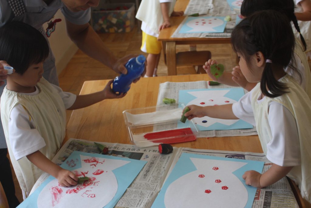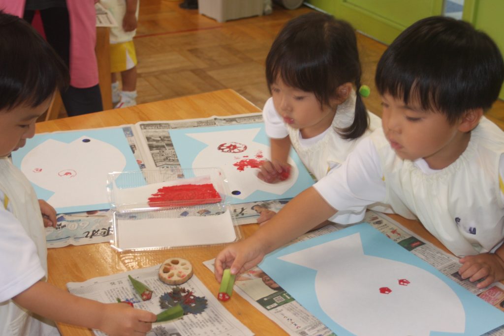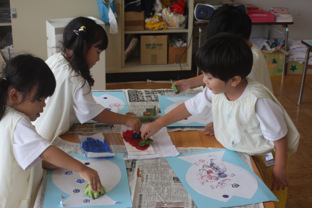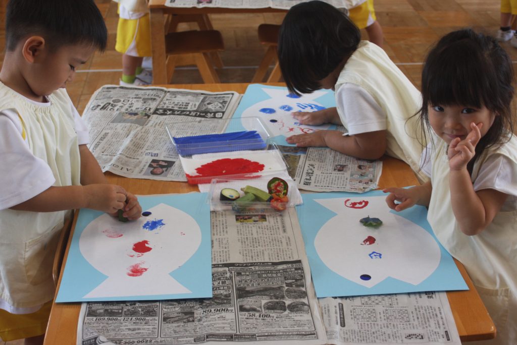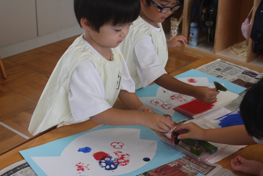 オクラ、ナス、ピーマンのヘタや固い大葉m青梗菜の付け根をスタンプにして、魚に模様をつけました。個性豊かな魚が仕上がりました。