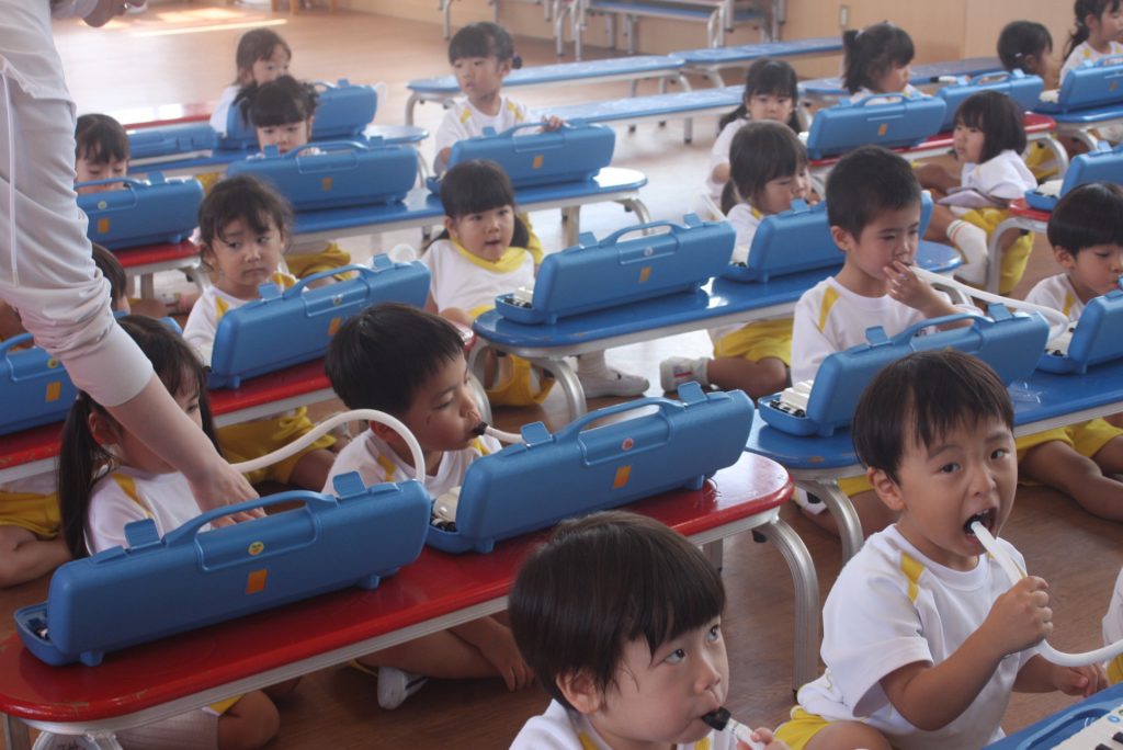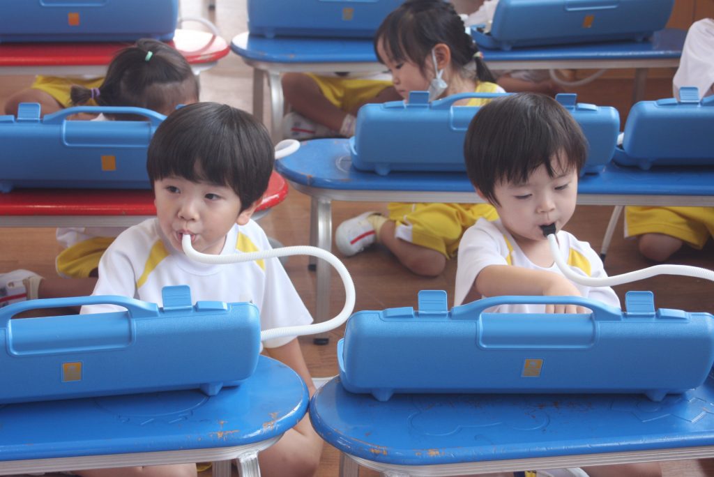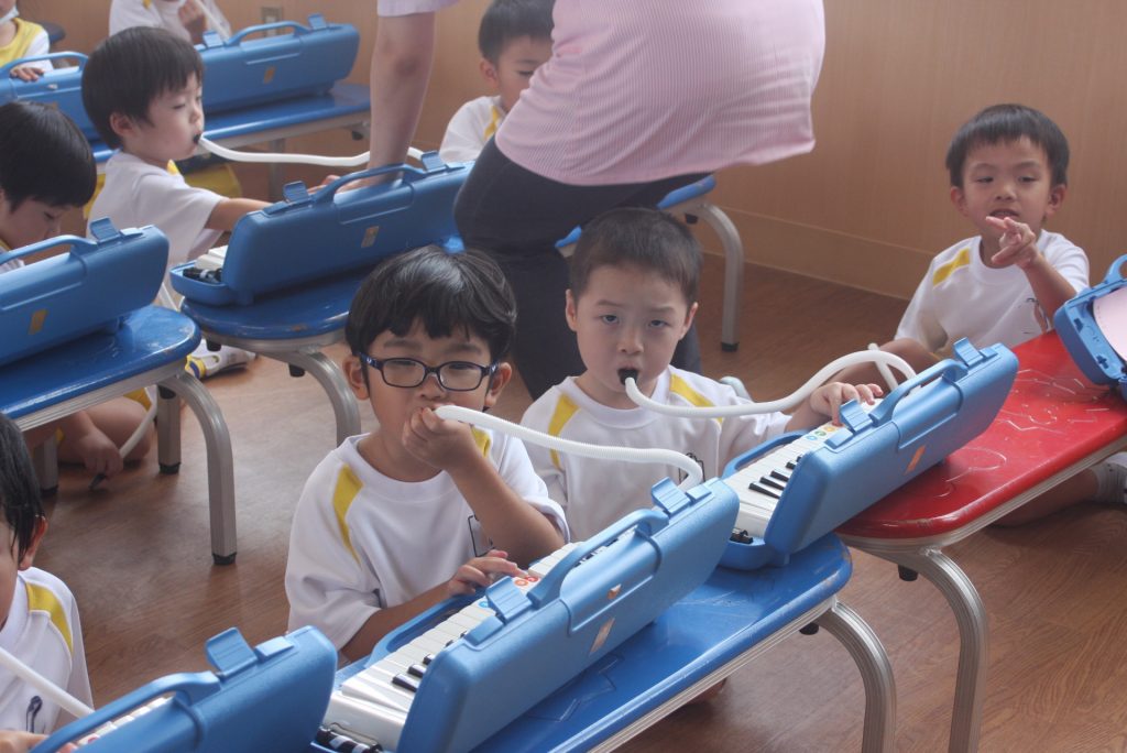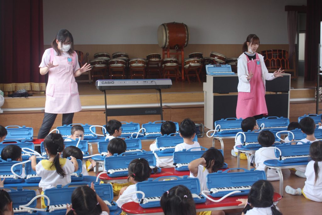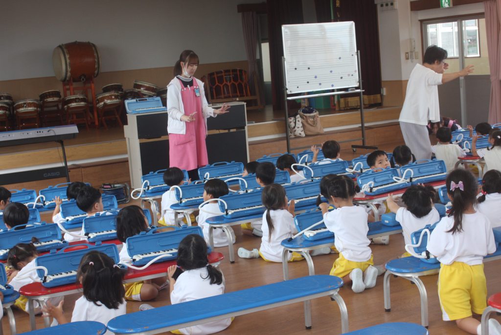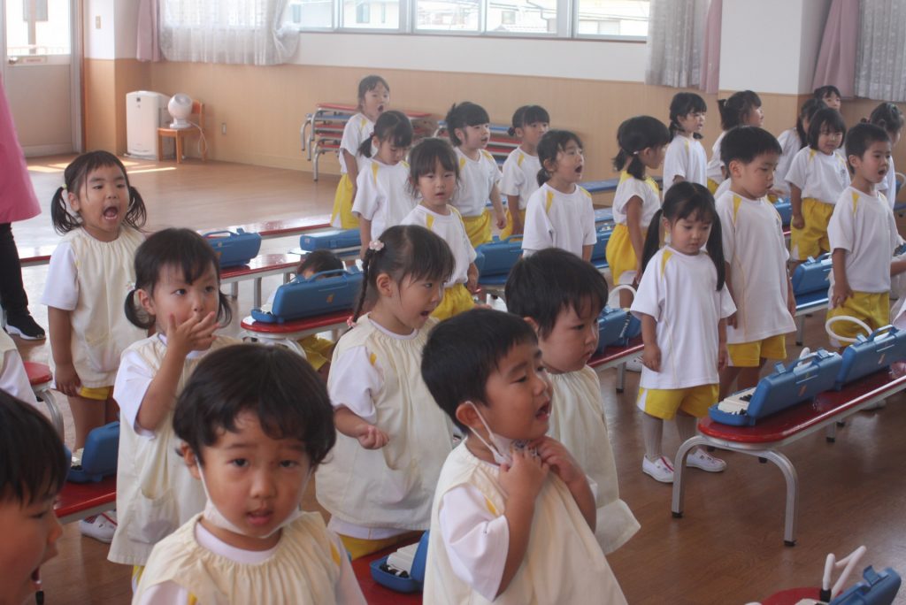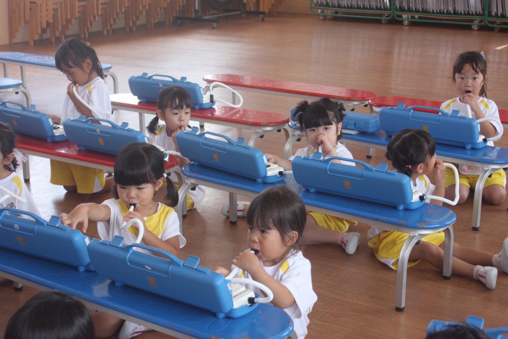 赤学年(年少)の子どもたちが、鍵盤ハーモニカの練習をがんばっています。「ド」「レ」「ド」「レ」・・・と力強く吹けるようになりました。