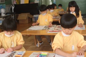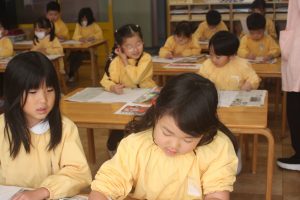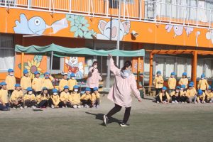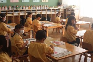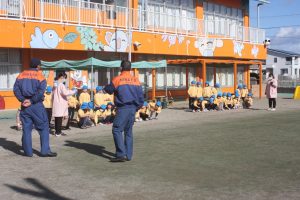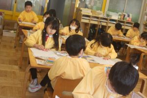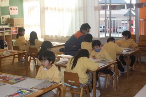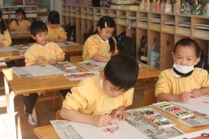 防火凧づくり 2025年12月15日 青学年(年長児) 丹羽消防の職員の方をお招きし、防火凧の制作を行いました。凧に防火の思いを込め、一人一人絵を描きました。本当は全員で凧揚げできるとよいのですが、代表して先生が凧揚げをしましたが、うまく揚がりませんでした。それでも、みんなからは「頑張れ!頑張れ!」の声があがりました。