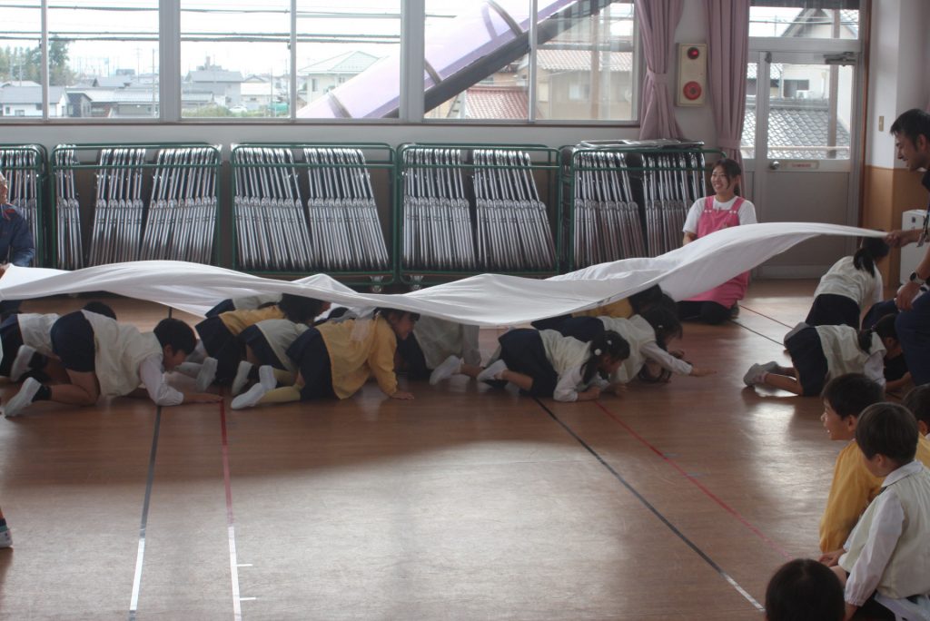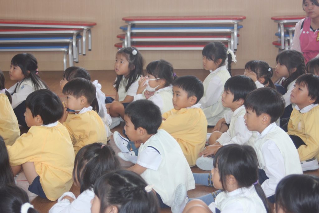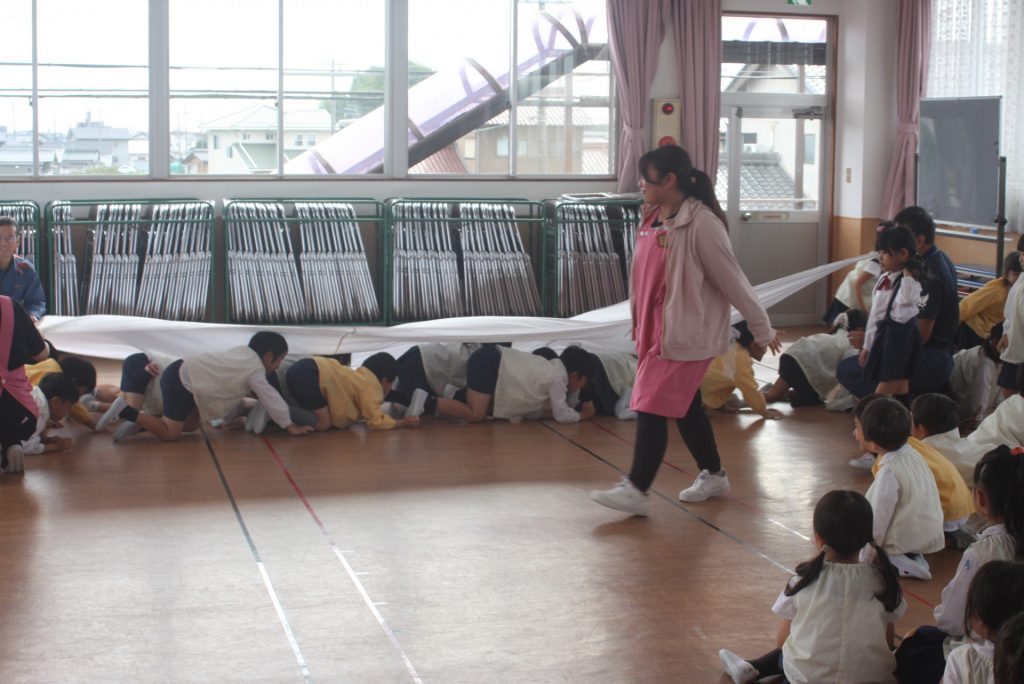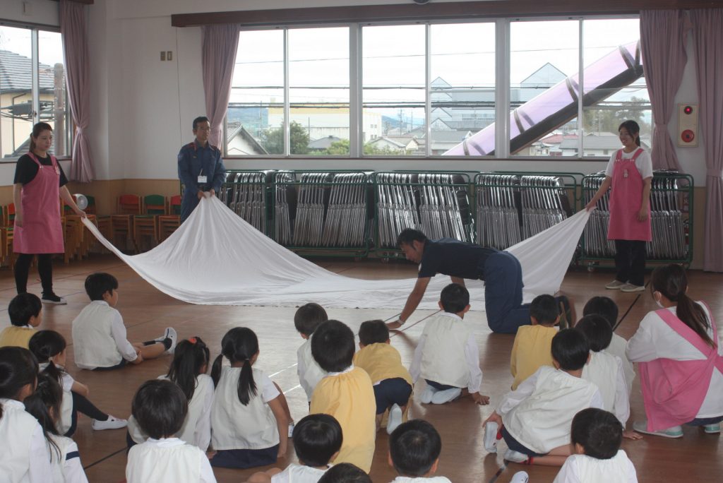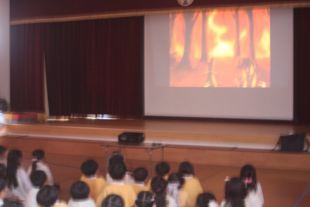 防火防災の話 2024年10月28日 青学年(年長児) 丹羽消防署より、職員の方に来ていただき、「防火防災の話」をしていただきました。子ぎつねの消防隊というDVDを視聴した後、実際に煙を見立てた布の下をくぐって避難する練習をしました。ありがとうございました。