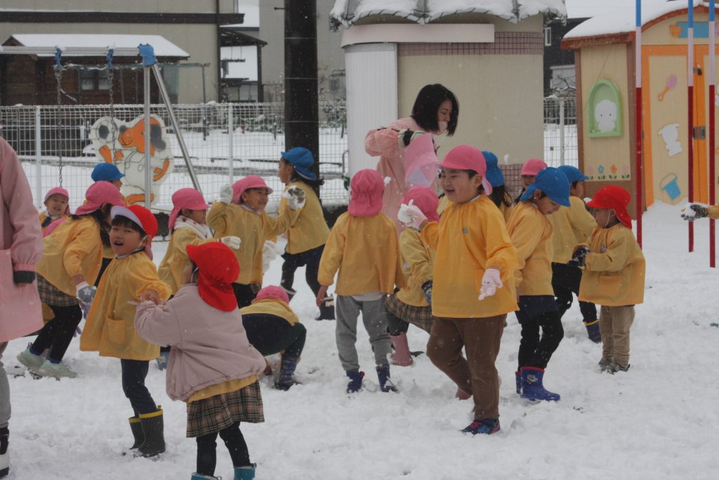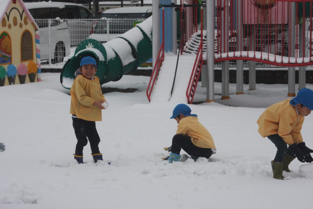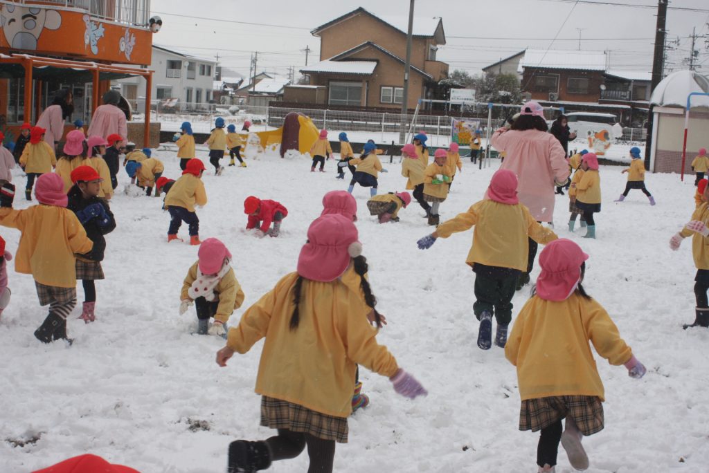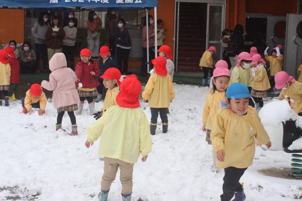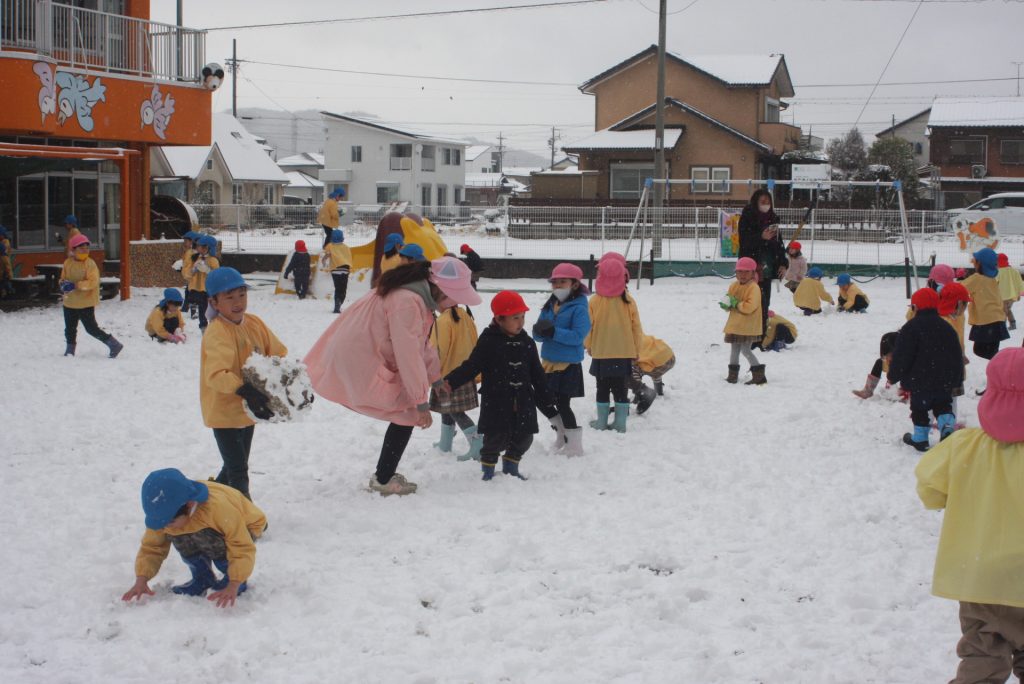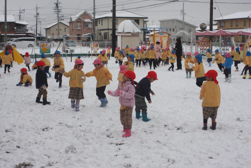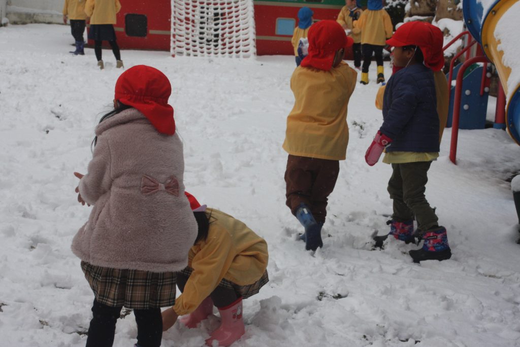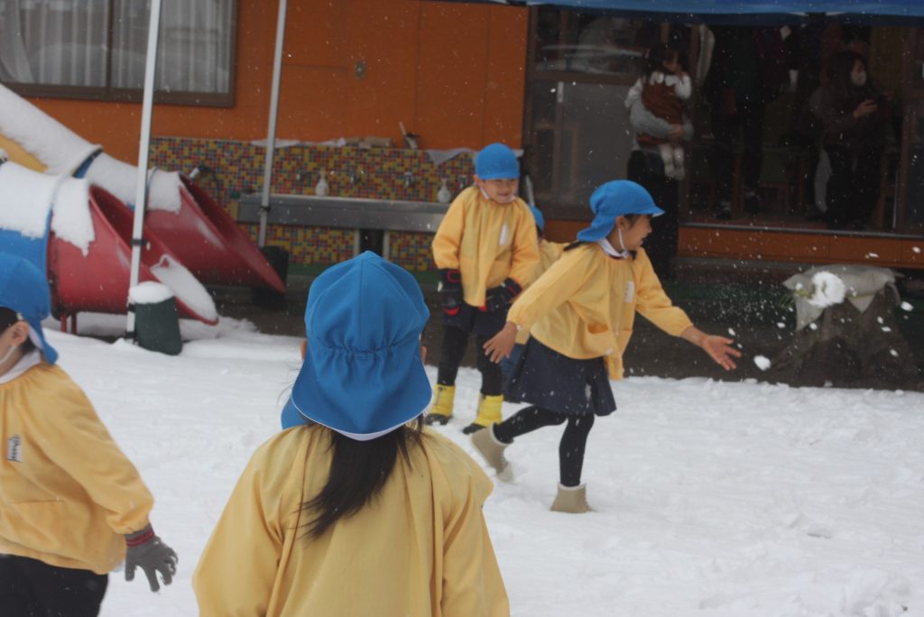 雪遊び 2025年01月10日 園の様子 初雪となりました。大人にとっては難儀な降雪ですが、子どもたちにとっては天からの恵みと言えるでしょうか。大喜びです。わずか10分間ですが、園庭で雪遊びを楽しみました。