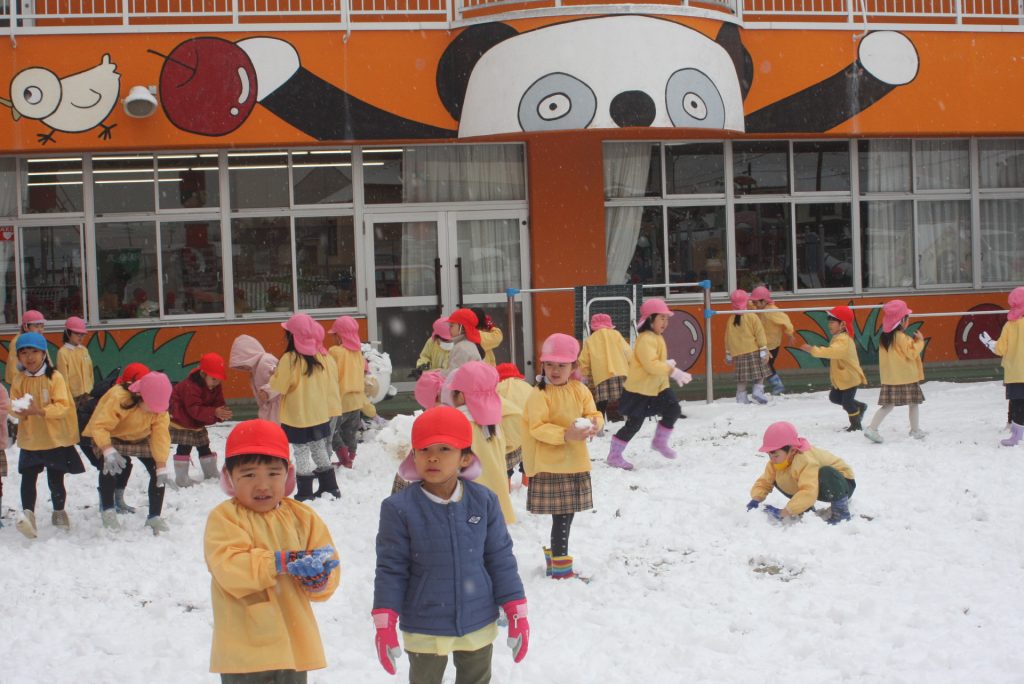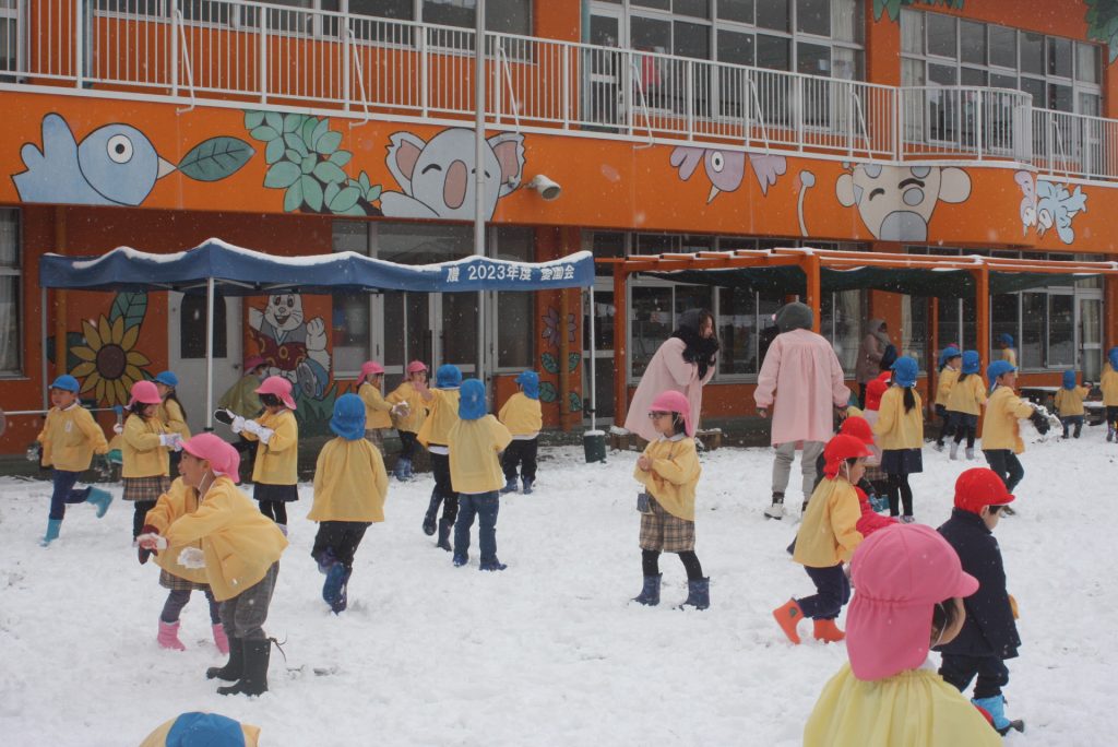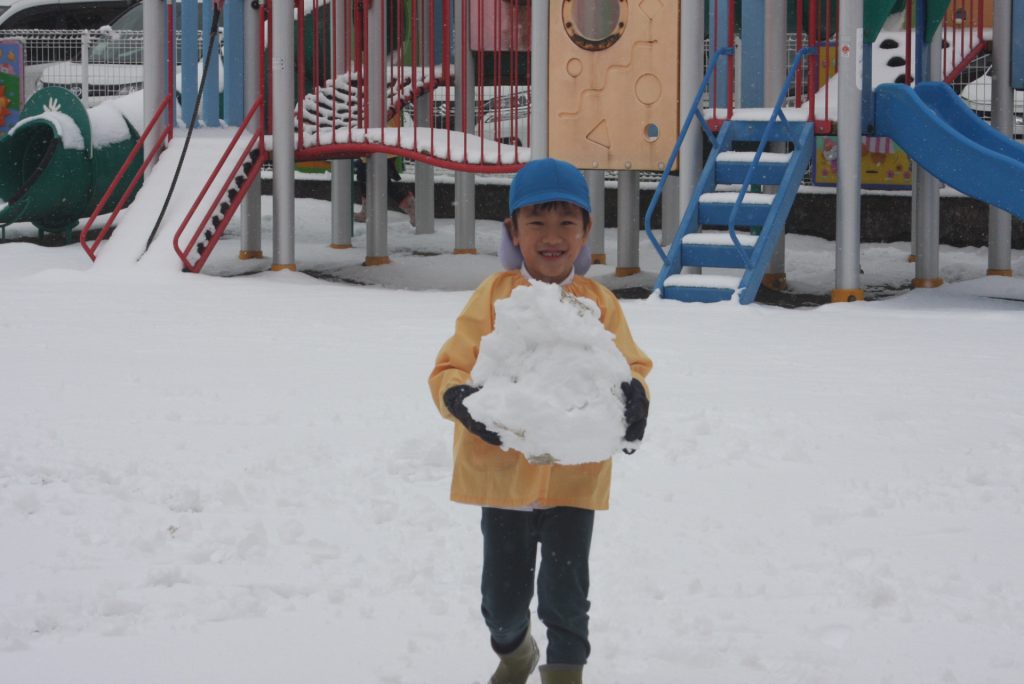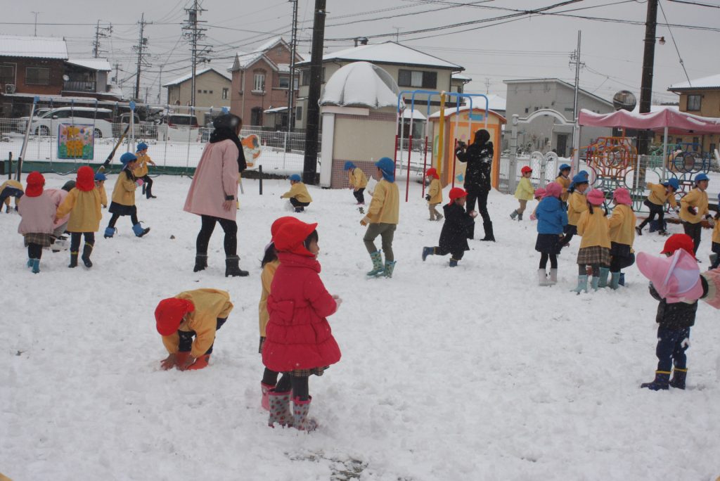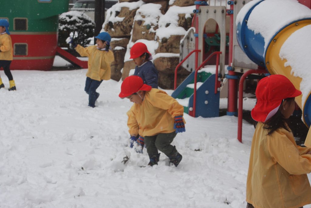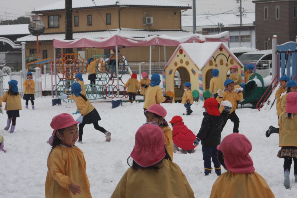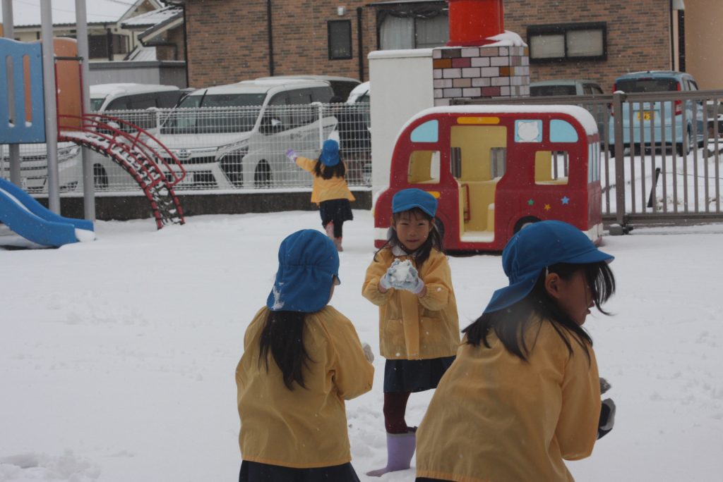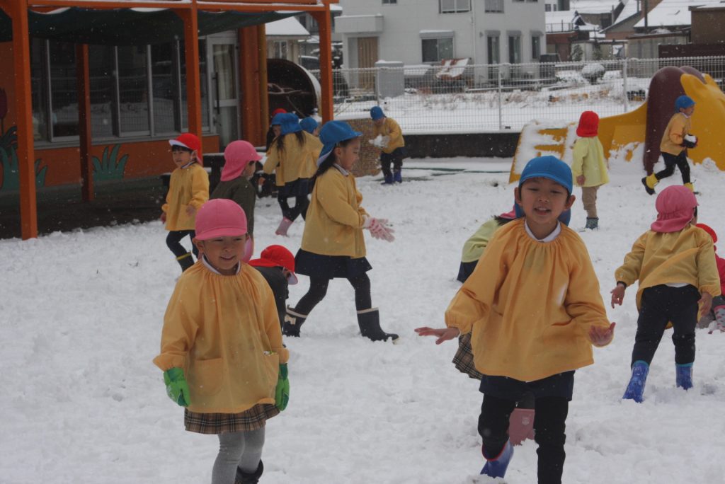 雪遊び 2025年01月10日 園の様子 初雪となりました。大人にとっては難儀な降雪ですが、子どもたちにとっては天からの恵みと言えるでしょうか。大喜びです。わずか10分間ですが、園庭で雪遊びを楽しみました。