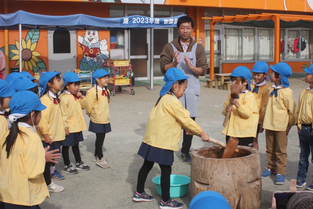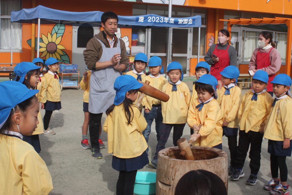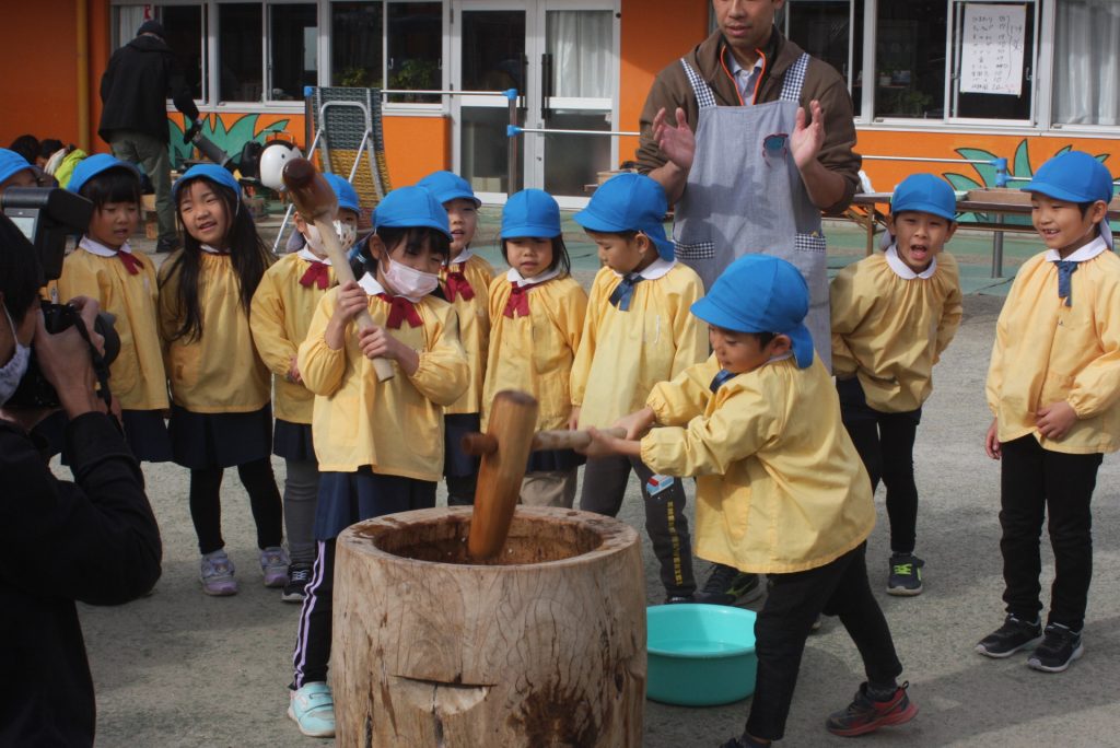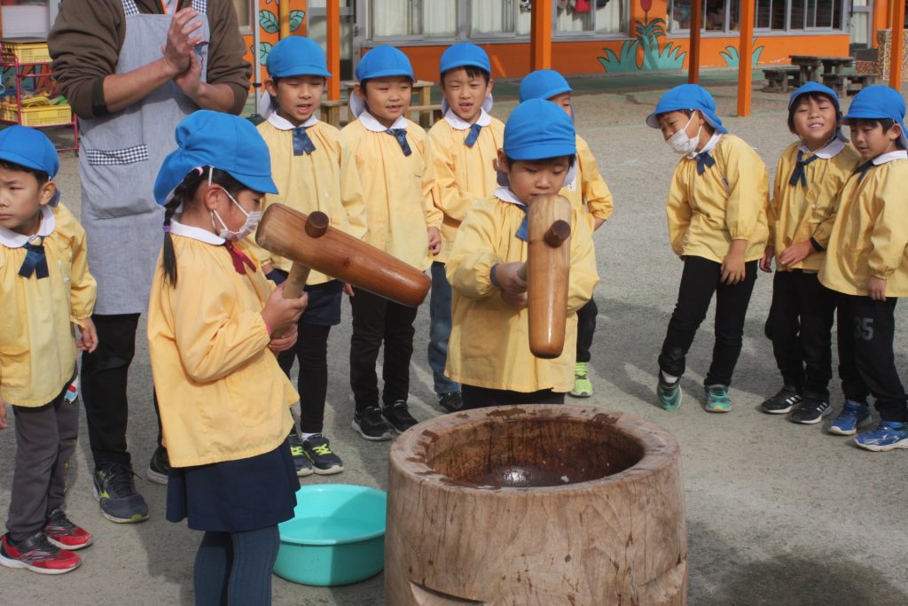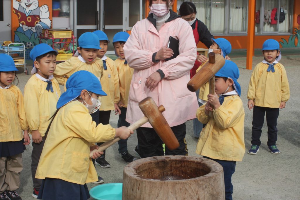 餅つき (青学年) 2024年12月20日 青学年(年長児) 本日、午前中に餅つきを行いました。青学年は、実際に自分の手で杵を使い、餅をつきました。お手伝いをいただいたバス運行委託会社のエポック様、運転手様、愛園会の役員、青学年委員の皆様、紀藤前園長様ご協力ありがとうございました。