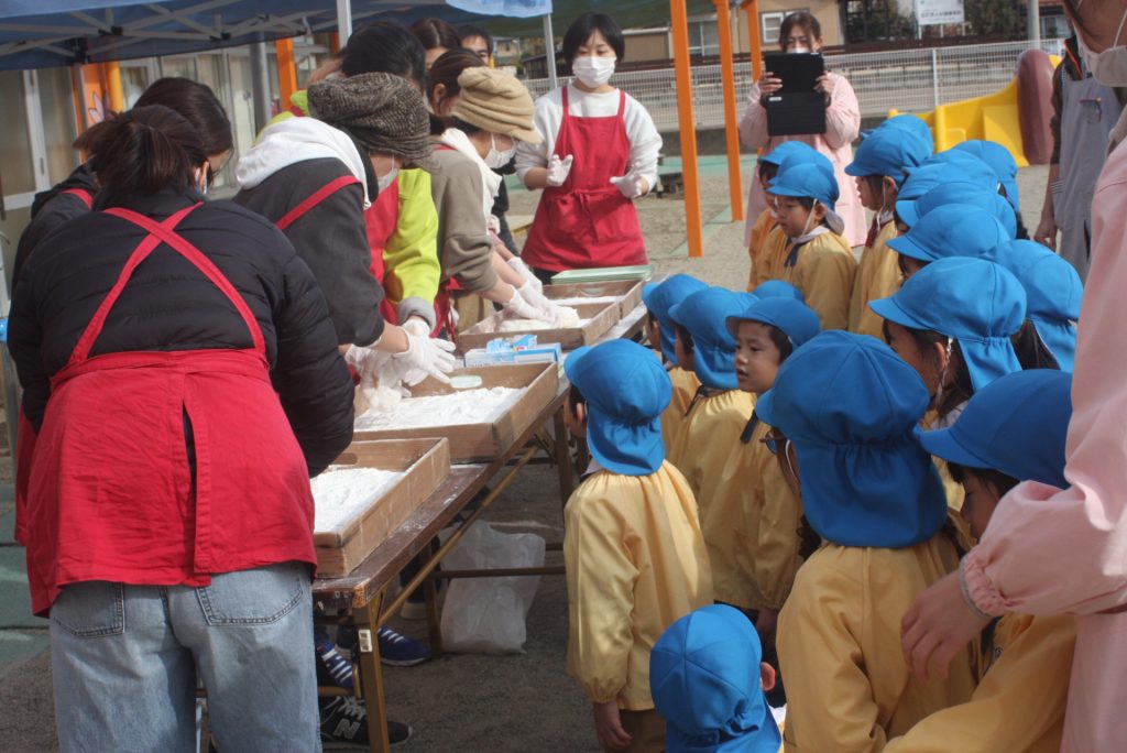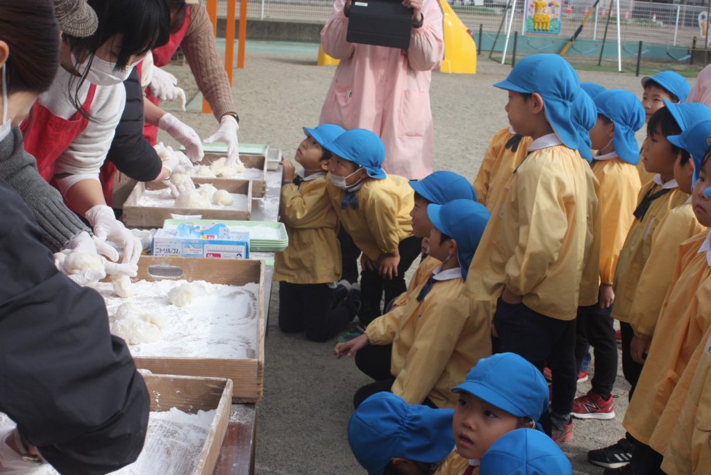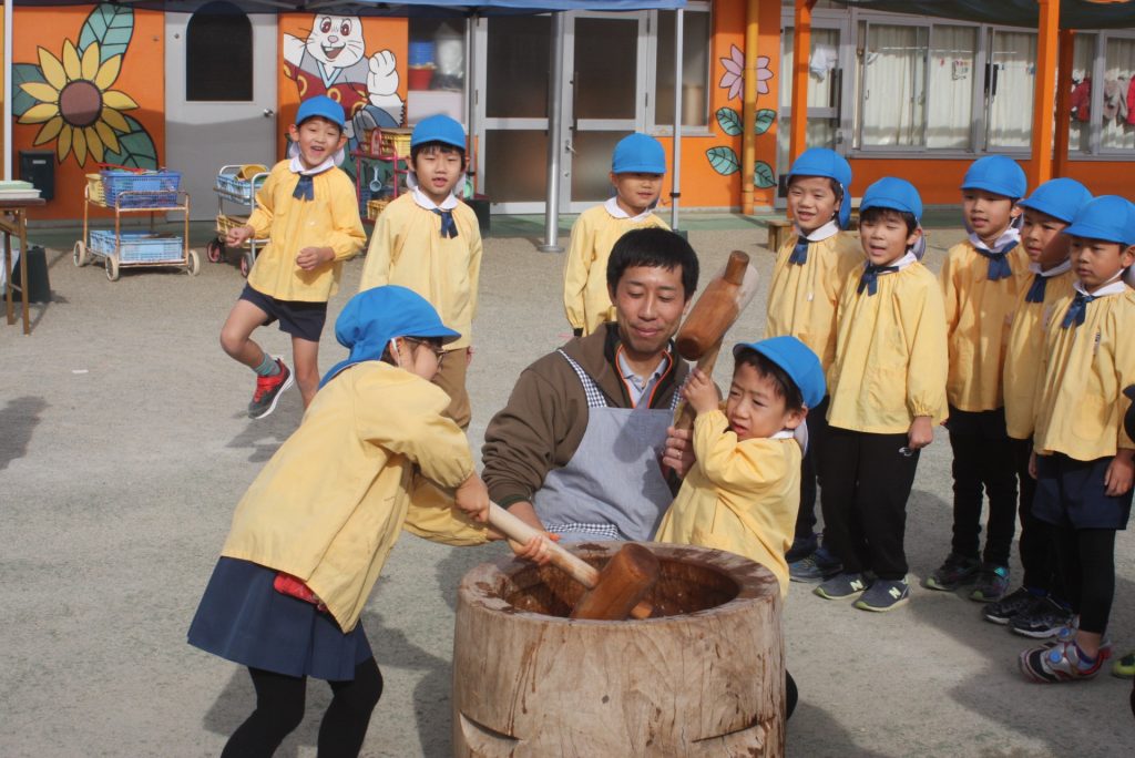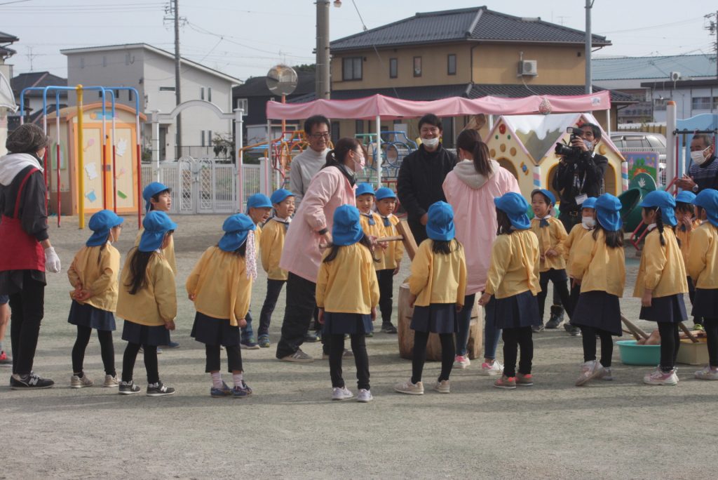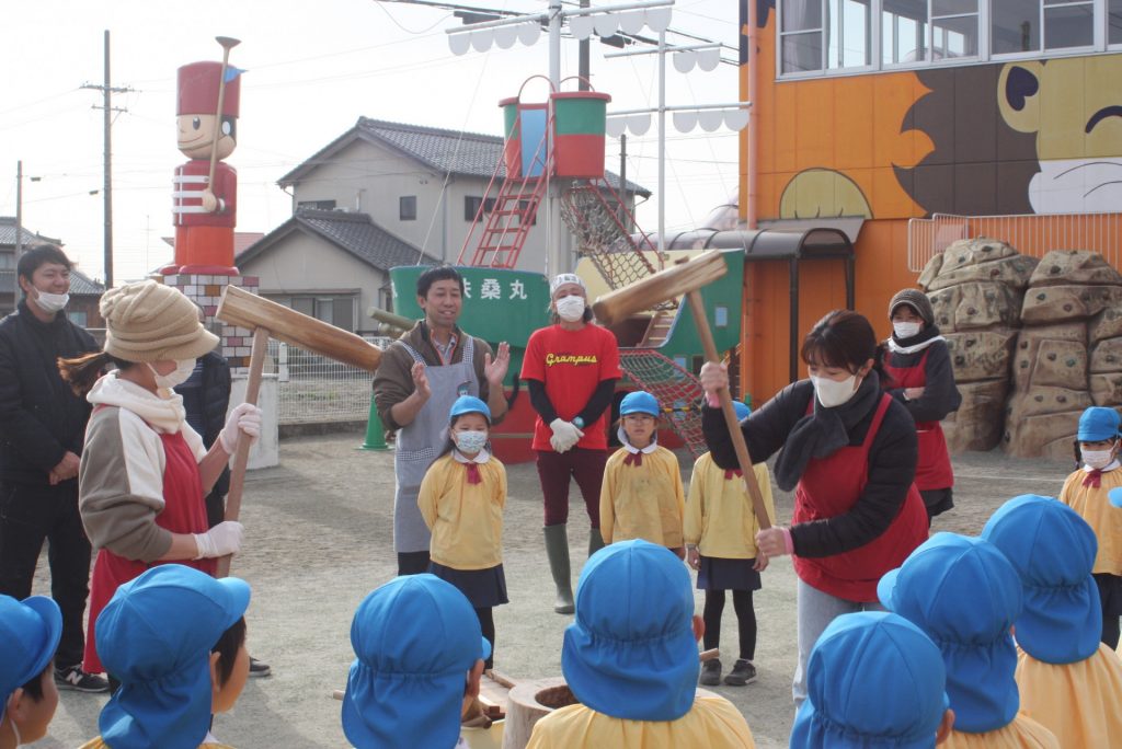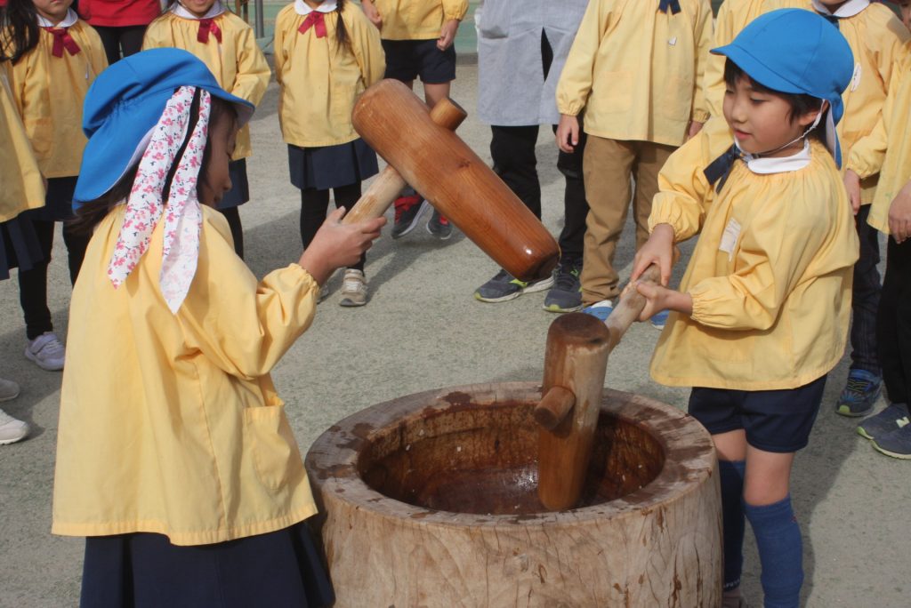 餅つき (青学年) 2024年12月20日 青学年(年長児) 本日、午前中に餅つきを行いました。青学年は、実際に自分の手で杵を使い、餅をつきました。お手伝いをいただいたバス運行委託会社のエポック様、運転手様、愛園会の役員、青学年委員の皆様、紀藤前園長様ご協力ありがとうございました。
