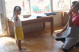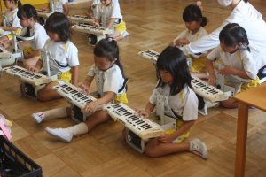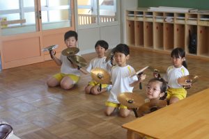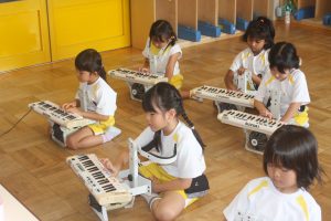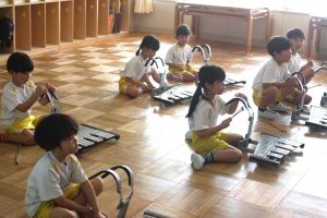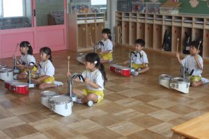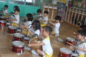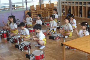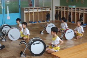 鼓隊練習 初日 2025年08月21日 青学年(年長児) 今日は、午前中に青学年(年長)が登園し、鼓隊練習を行いました。初日とは、思えないほどの取り組みです。先生の説明を一生懸命に聞き、練習に励んでいます。演奏の披露は、10月7日(火)運動会で行います。