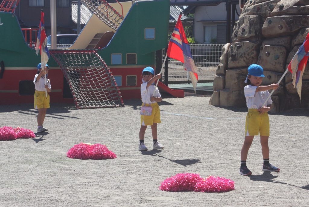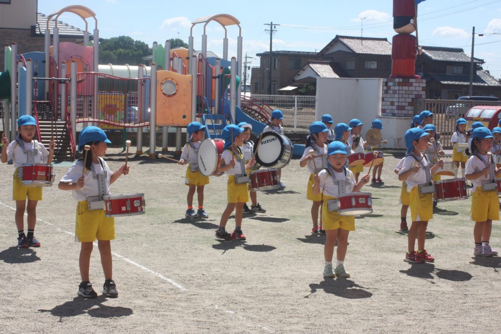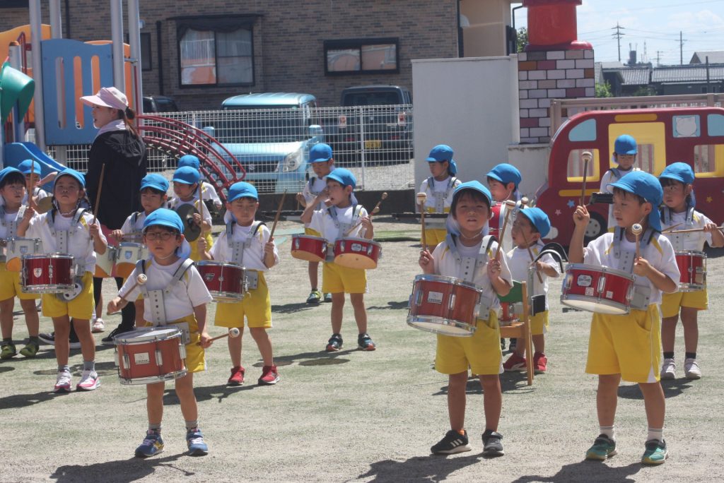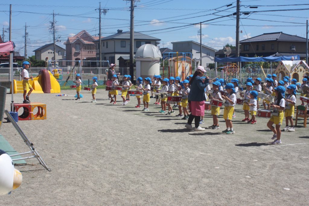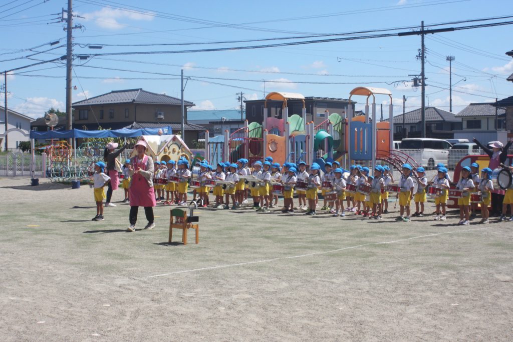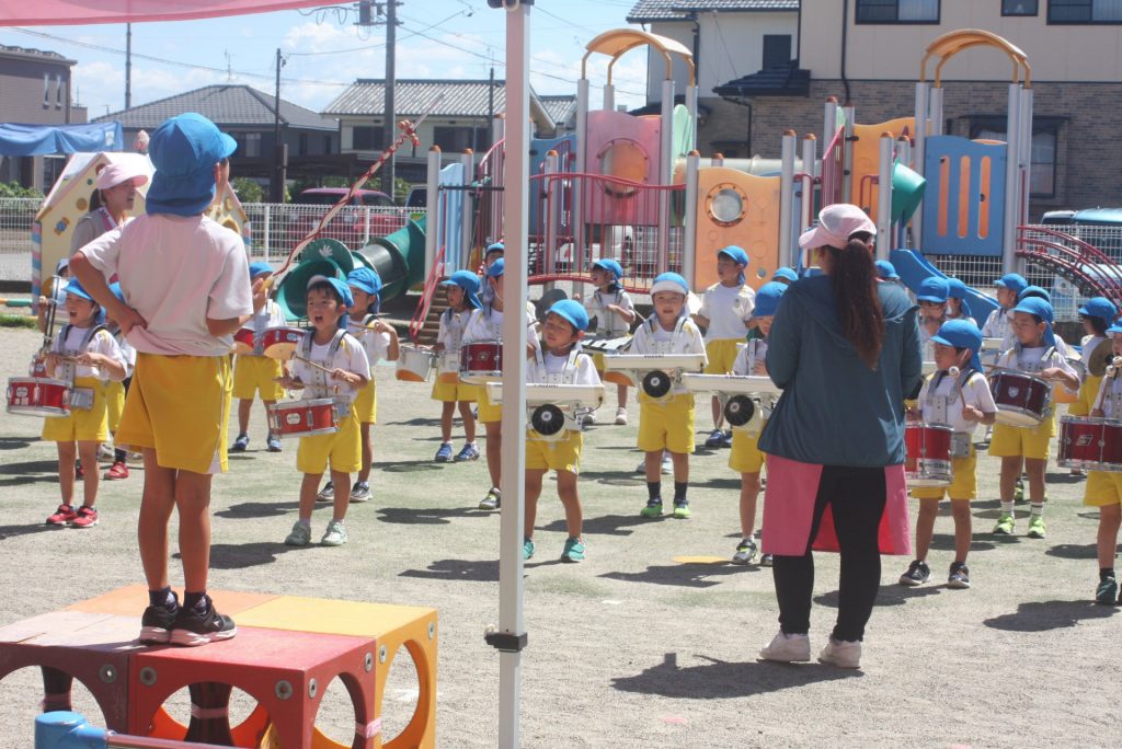 初めて園庭で鼓隊練習をしました。気温が高い中でしたが、集中して短時間に練習を進めました。