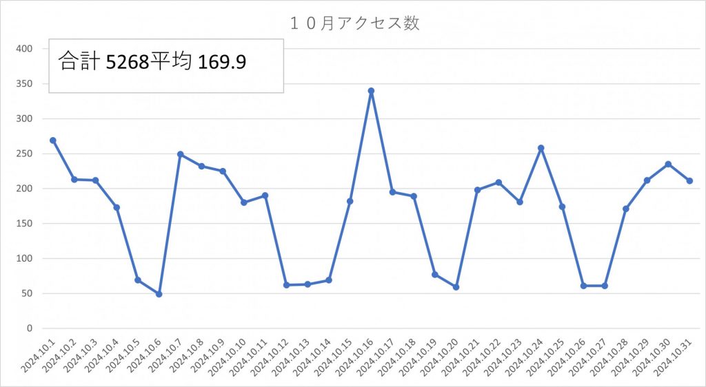 10月ホームページへの閲覧状況は、アクセスページ5268、アクセス人数平均169.9名でした。