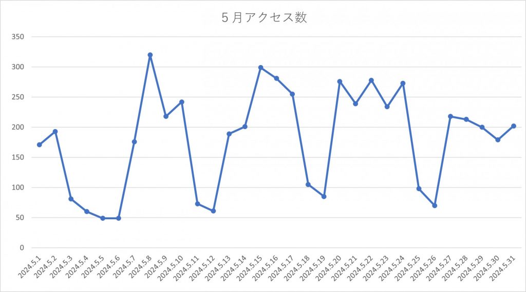 5月のアクセス数は、5588で、アクセス人数の1日の平均は180.3人でした。4月より、わずかに向上しました。